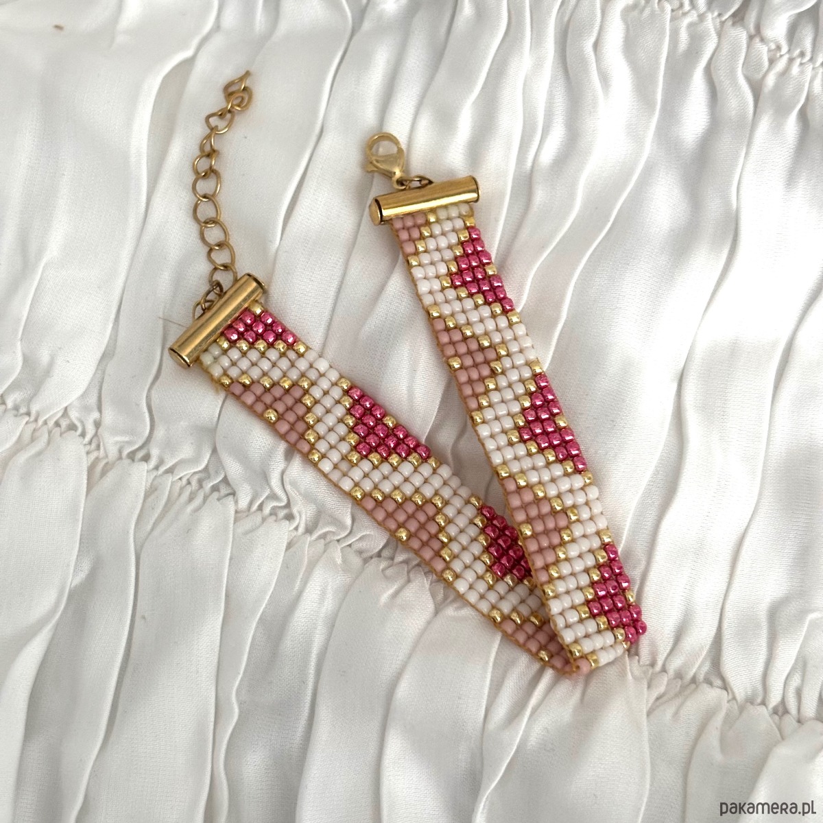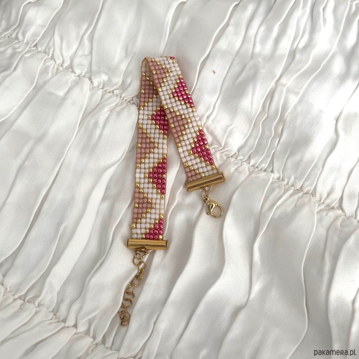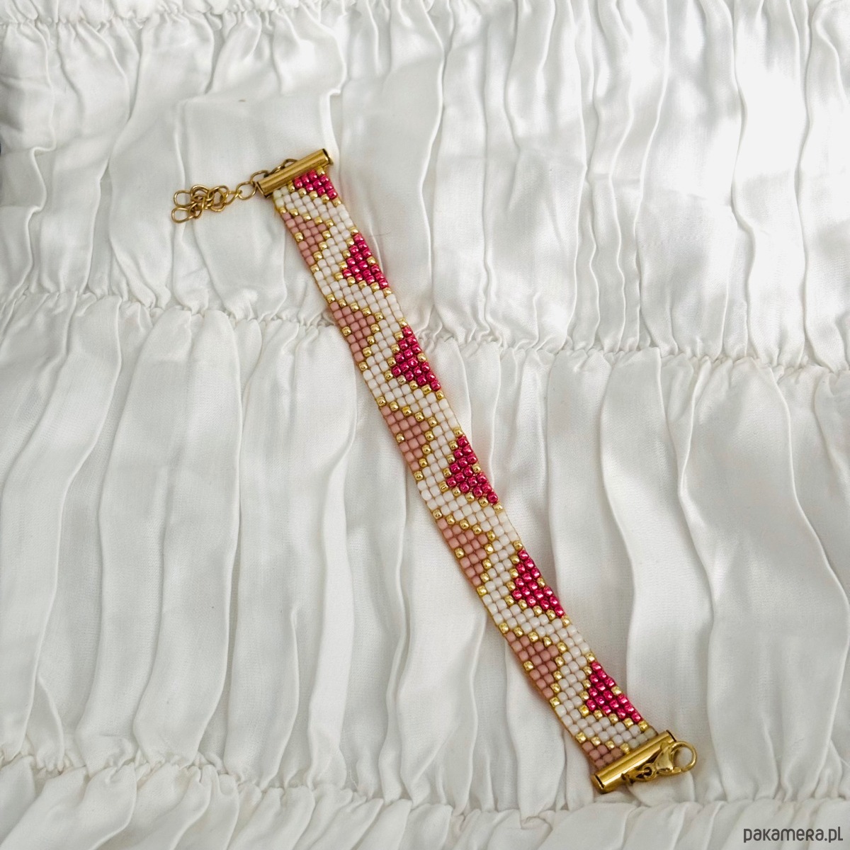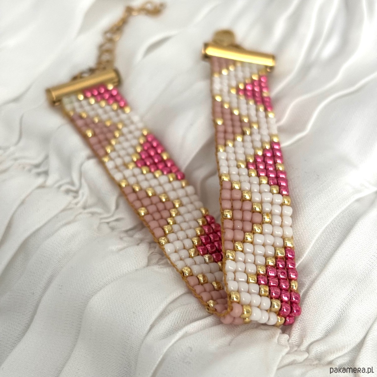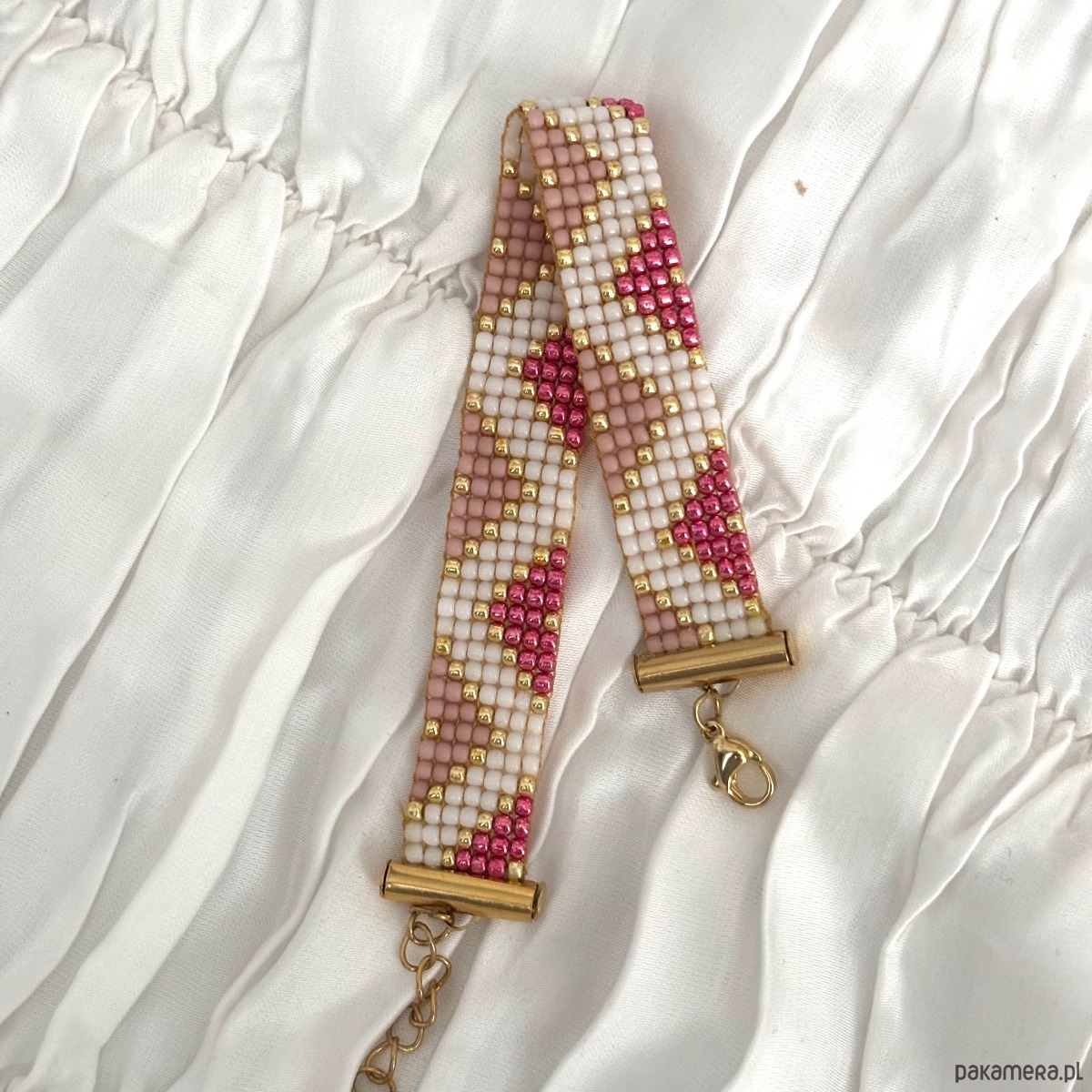 Ręcznie wykonana bransoletka z wysokiej jakości szklanych koralików TOHO, cenionych za perfekcyjną regularność, trwałość i intensywność koloru. Starannie utkany wzór łączy odcienie pudrowego różu, bieli oraz złotych akcentów, tworząc elegancką i kobiecą kompozycję.