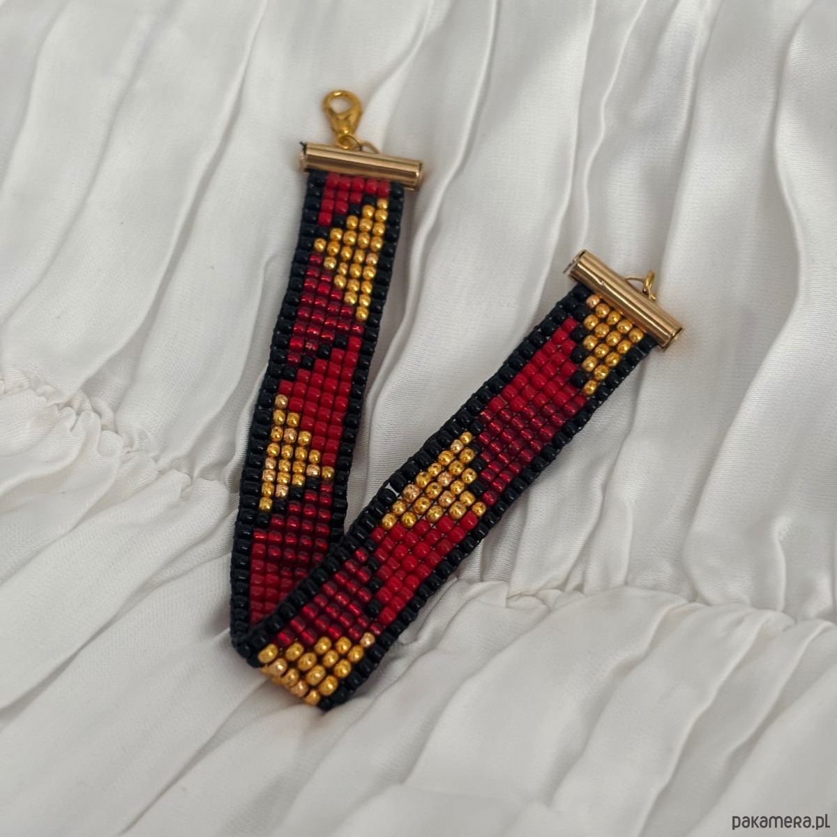 Ręczne wykonanie i staranne wykończenie gwarantują wysoką jakość oraz komfort noszenia. Intensywne kolory i złote akcenty nadają jej wyrazisty, a jednocześnie elegancki charakter, dzięki czemu doskonale uzupełni zarówno codzienne stylizacje, jak i bardziej wyjątkowe okazje.