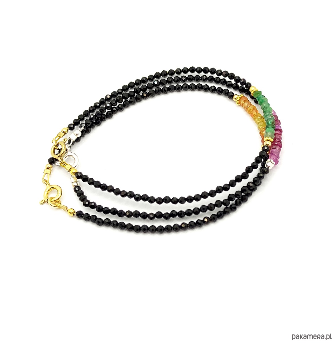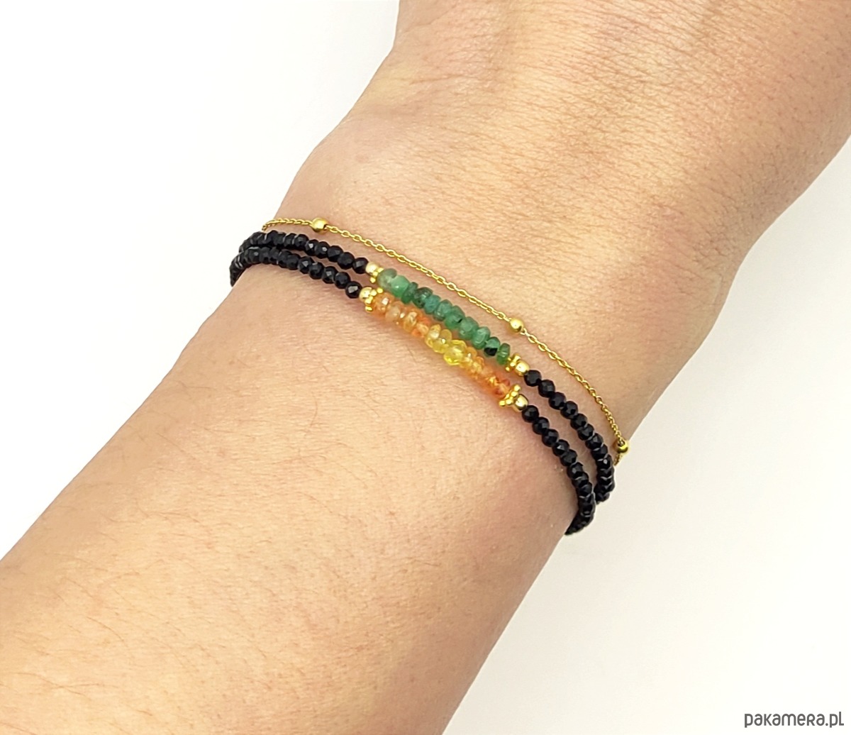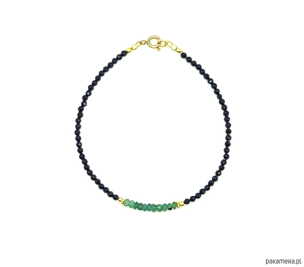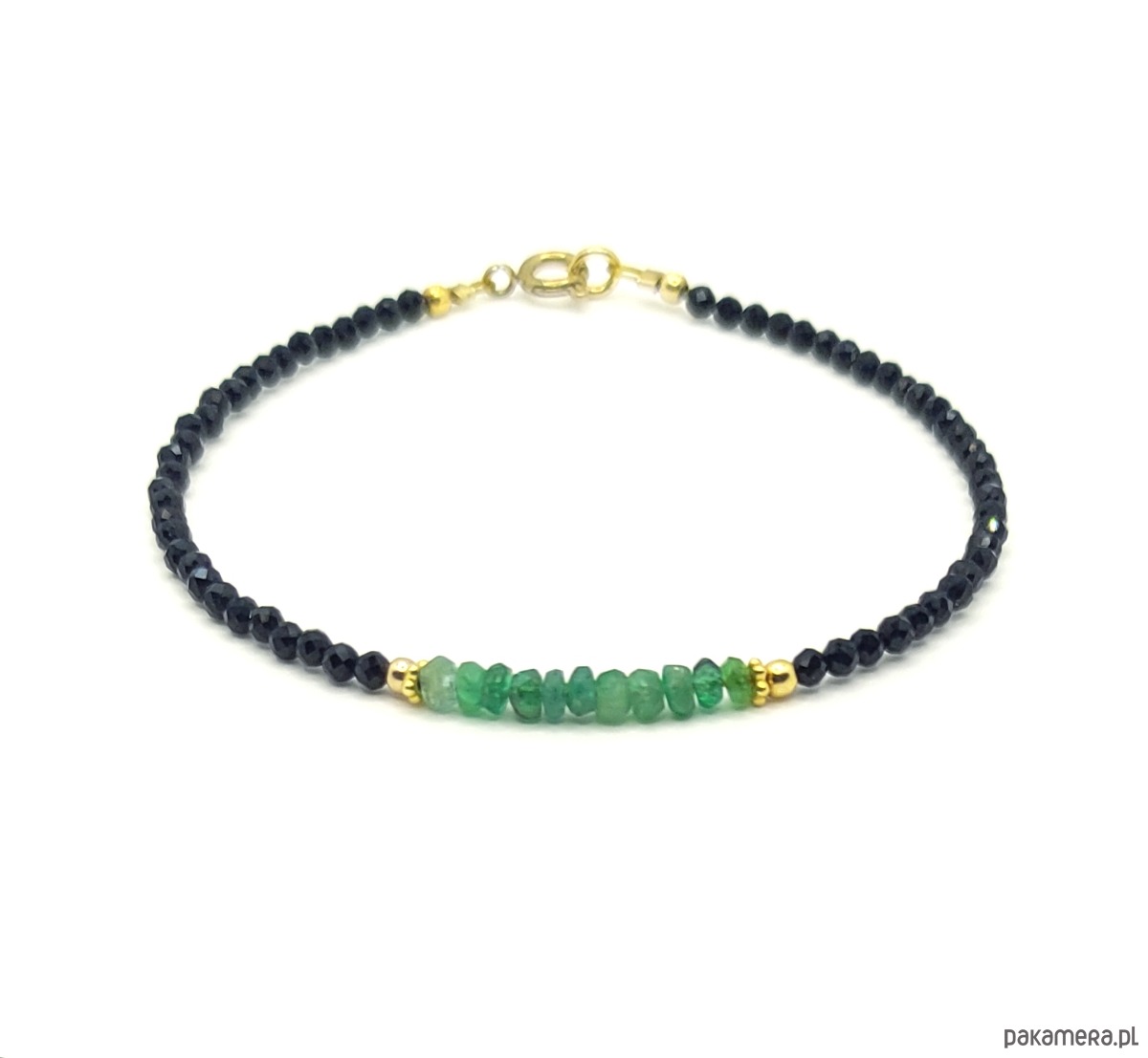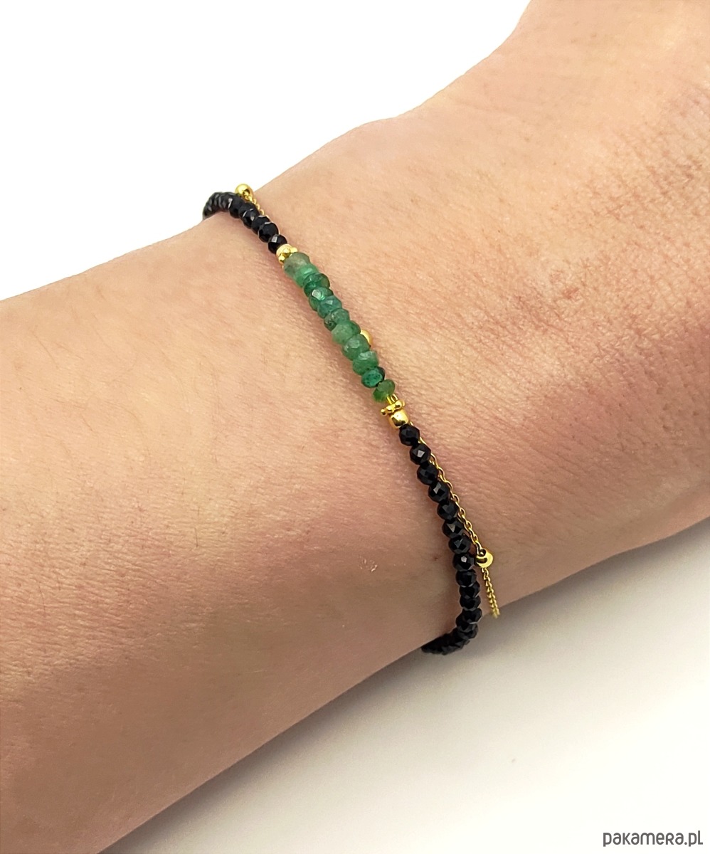 Esencjonalne szmaragdy na tle czarnego spinela. Szmaragd jest jednym z najbardziej pożądanych kamieni, a okazy dobrej jakości są niezwykle rzadkie. Szmaragdowe oponki na bransoletce są namiastką luksusu i oznaką szlachetnego gustu.