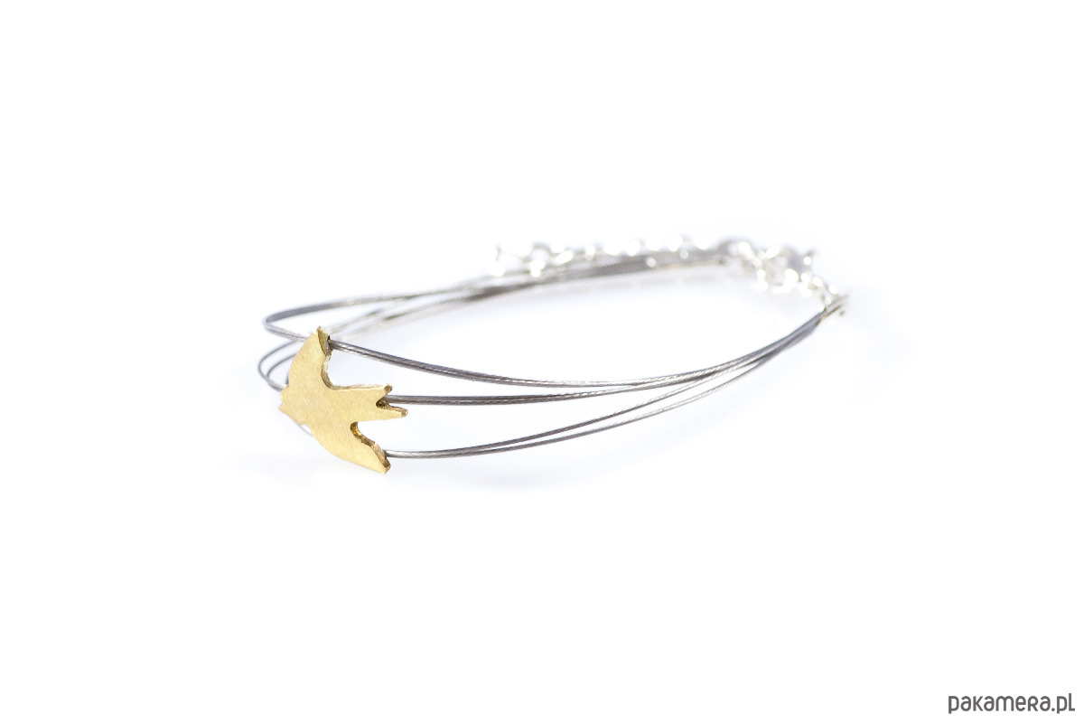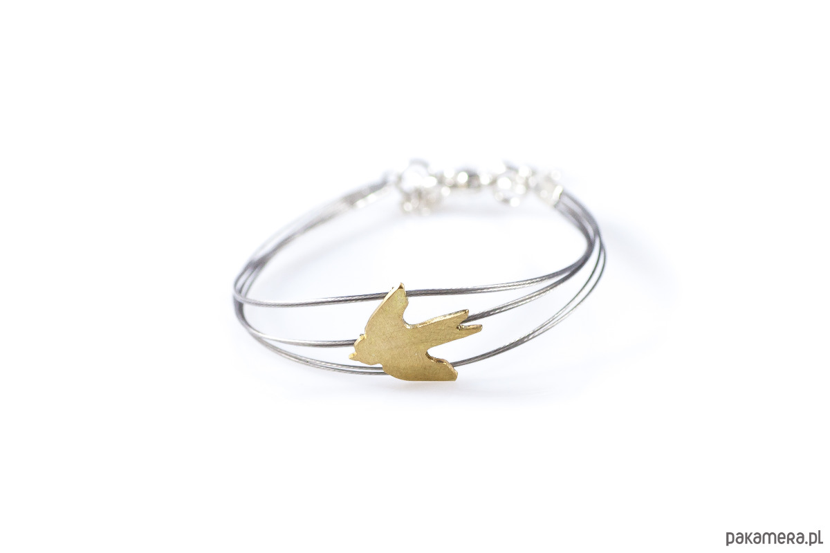 Jaskółka wielkości około 2 cm, przymocowana do linek o długości około 14cm. Przy zapięciu jest