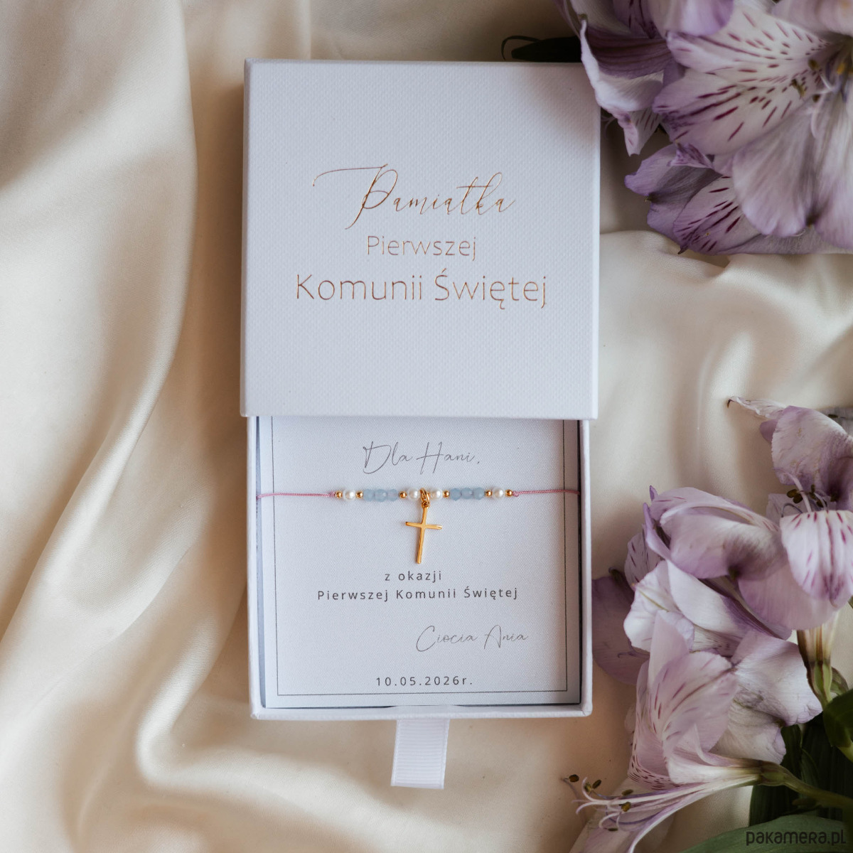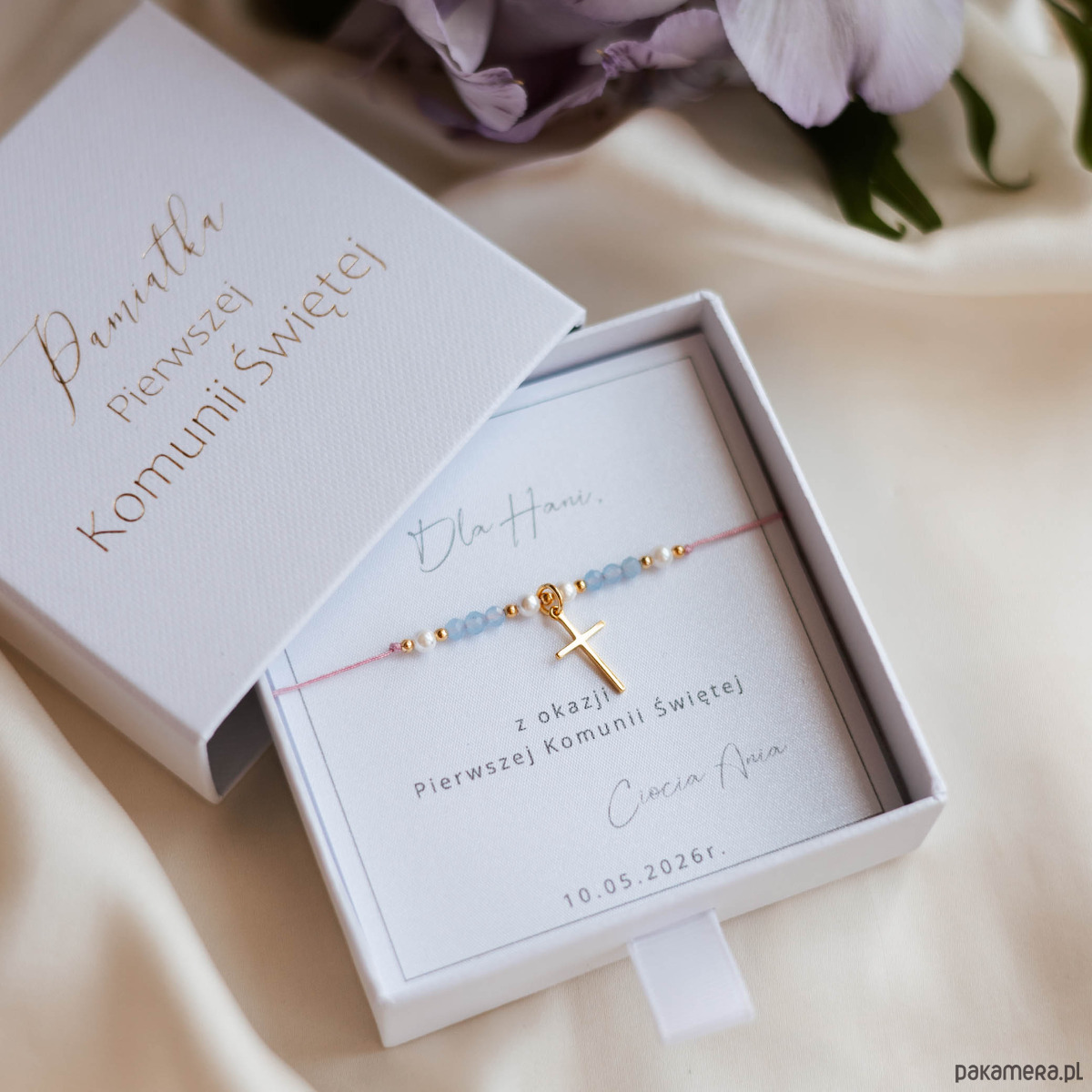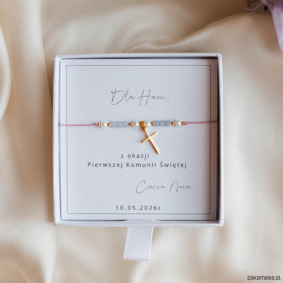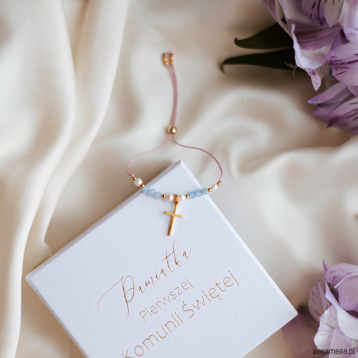 Delikatna bransoletka komunijna stworzona jako wyjątkowa pamiątka Pierwszej Komunii Świętej. Wykonana ręcznie z drobnych perełek, naturalnego akwamarynu oraz złotych kulek ze stali szlachetnej. Całość uzupełnia subtelny krzyżyk z pozłacanego srebra, który podkreśla symboliczny i religijny charakter biżuterii.