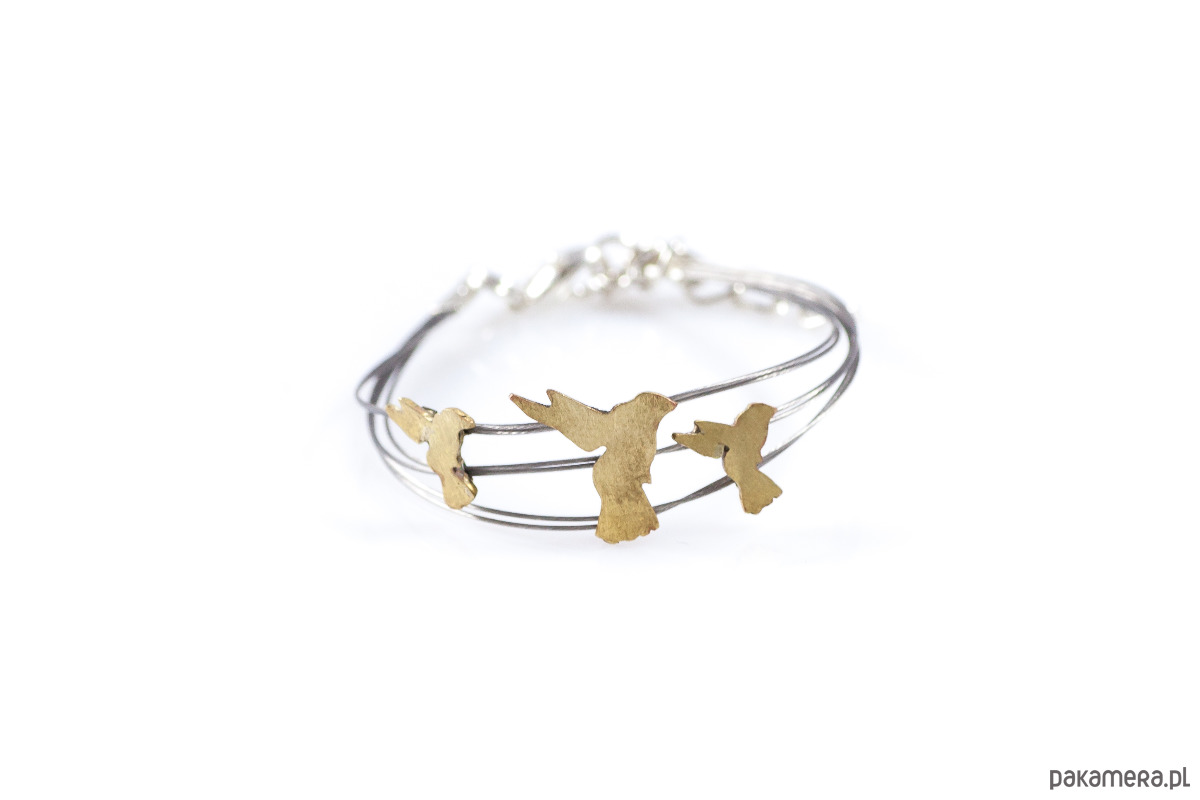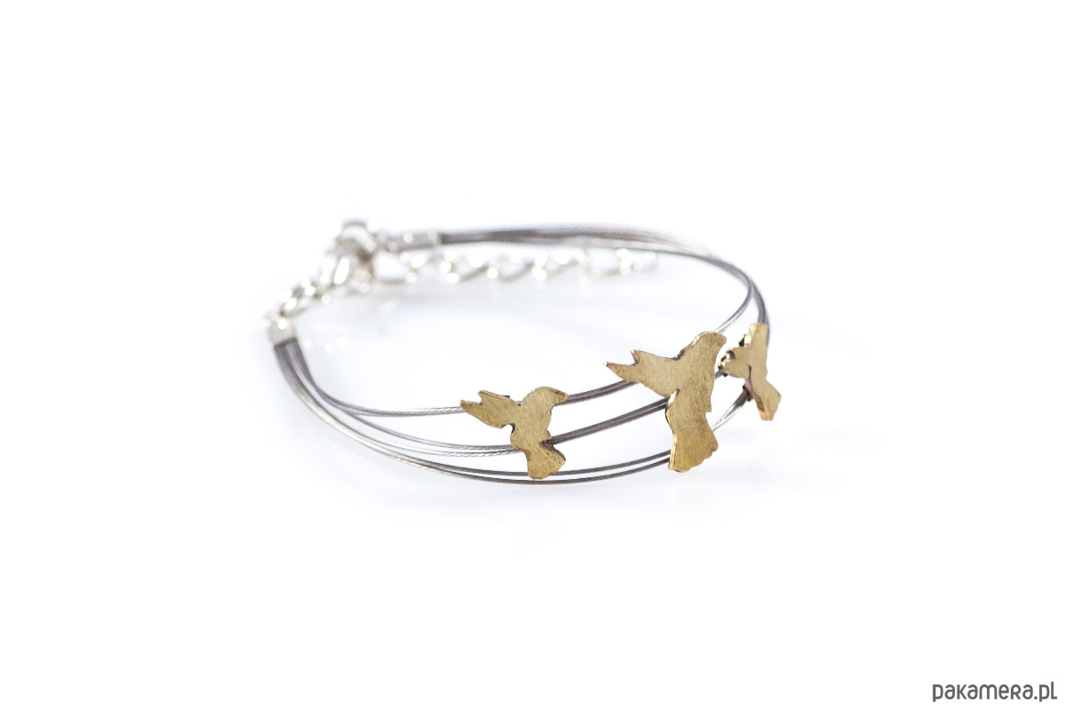 Koliberki wielkości około 1- 1,5 cm, przymocowane do stalowych linek o długości około 14 cm. Przy zapięciu jest