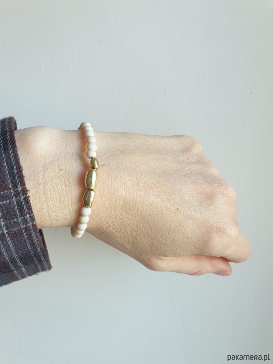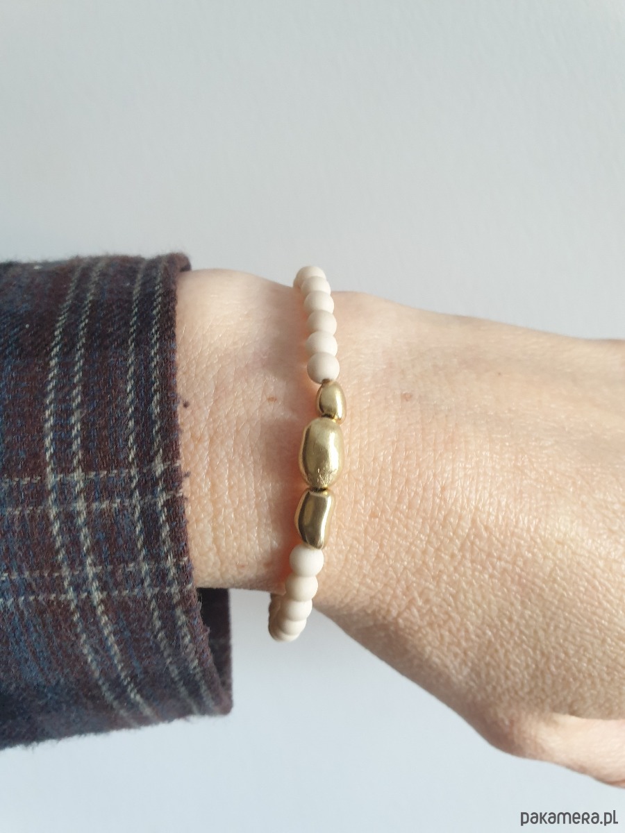 Bransoletka z kolekcji ZEN tworzona z kamienie naturalnych, tutaj jaspis river (kamień rzeczny) i nieregularnych elementów z surowego mosiądzu, ręcznie formowanych i matowionych (każdy egzemplarz unikatowy). Na zdjęciu przykładowa bransoletka, tworzę je z tych samych kamyczków i elementów, ale mogą być minimalne różnice w odcieniu kamienia i formie elementów z mosiądzu.