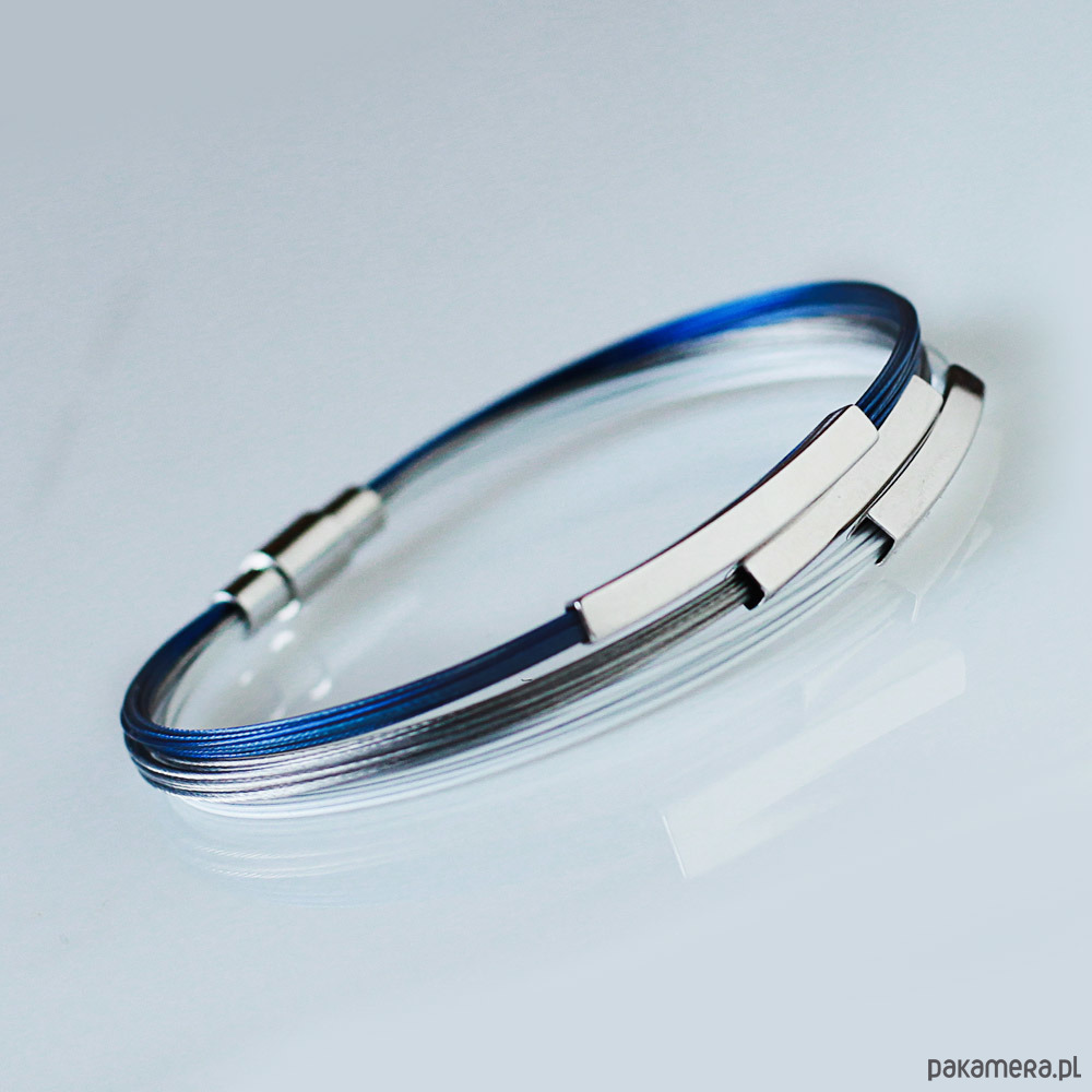 Bransoleta wykonana ze stalowych linek krytych nylonem oraz sztabek wykonanych z mosiądzu platerowanego rodem.