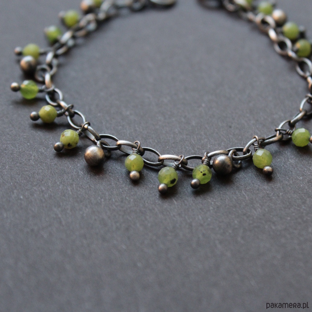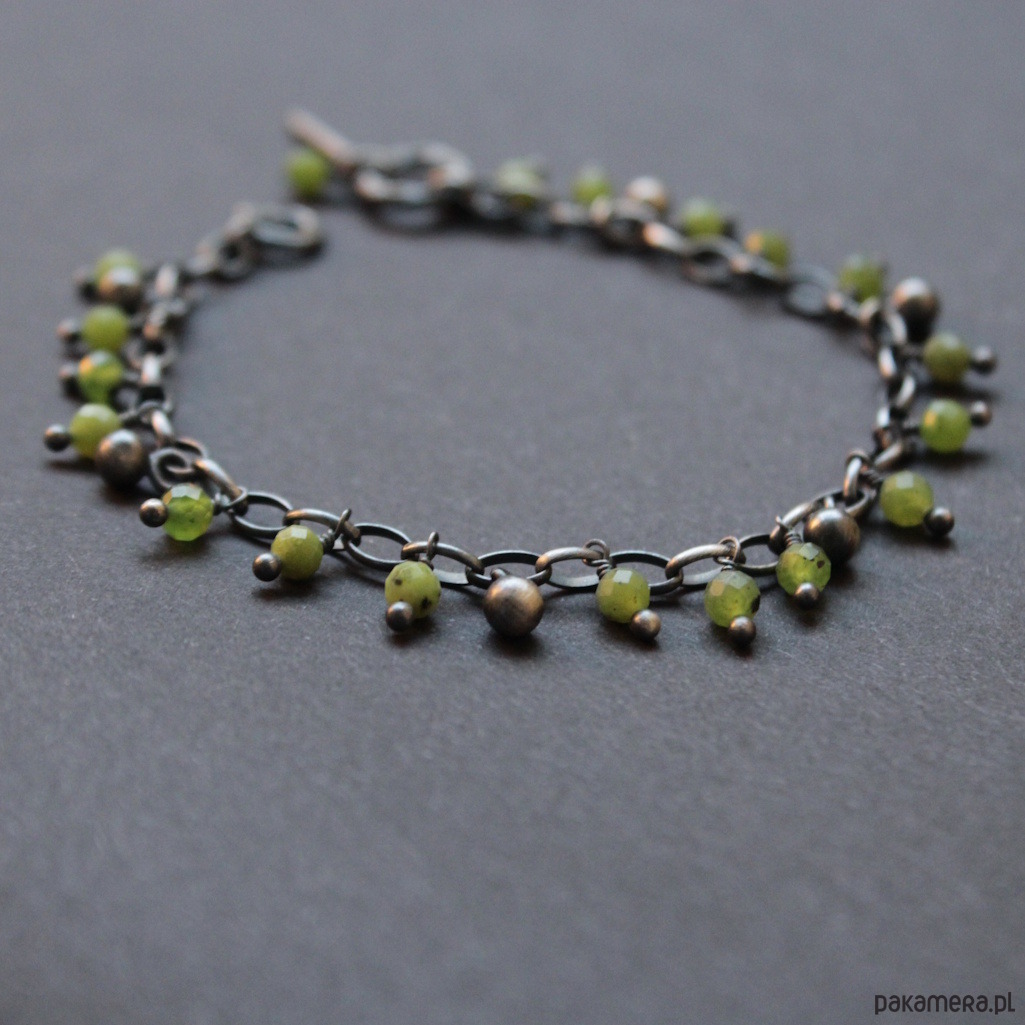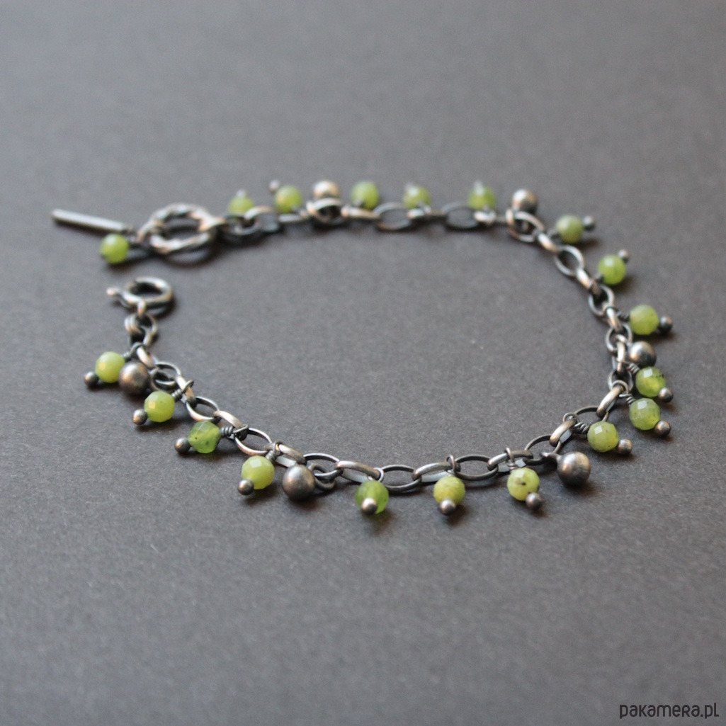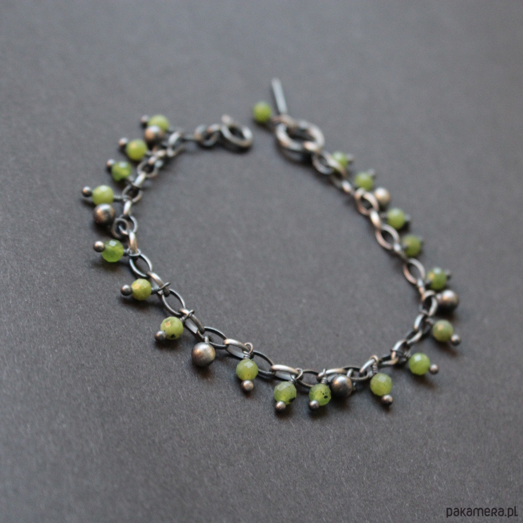 Bransoletka wykonana została z oksydowanego srebra oraz kuleczek fasetowanych nefrytów.