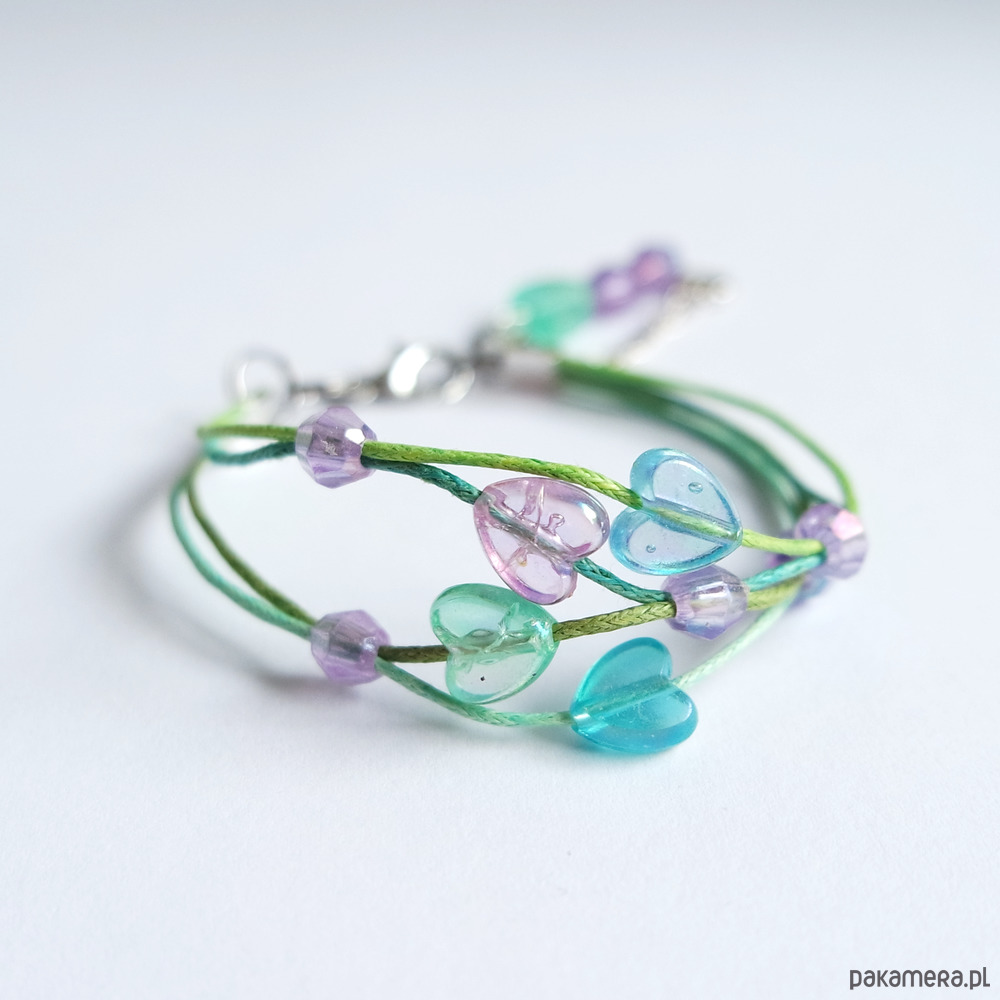 Bransoletka zrobiona jest z woskowanych sznureczków oraz koralików.
