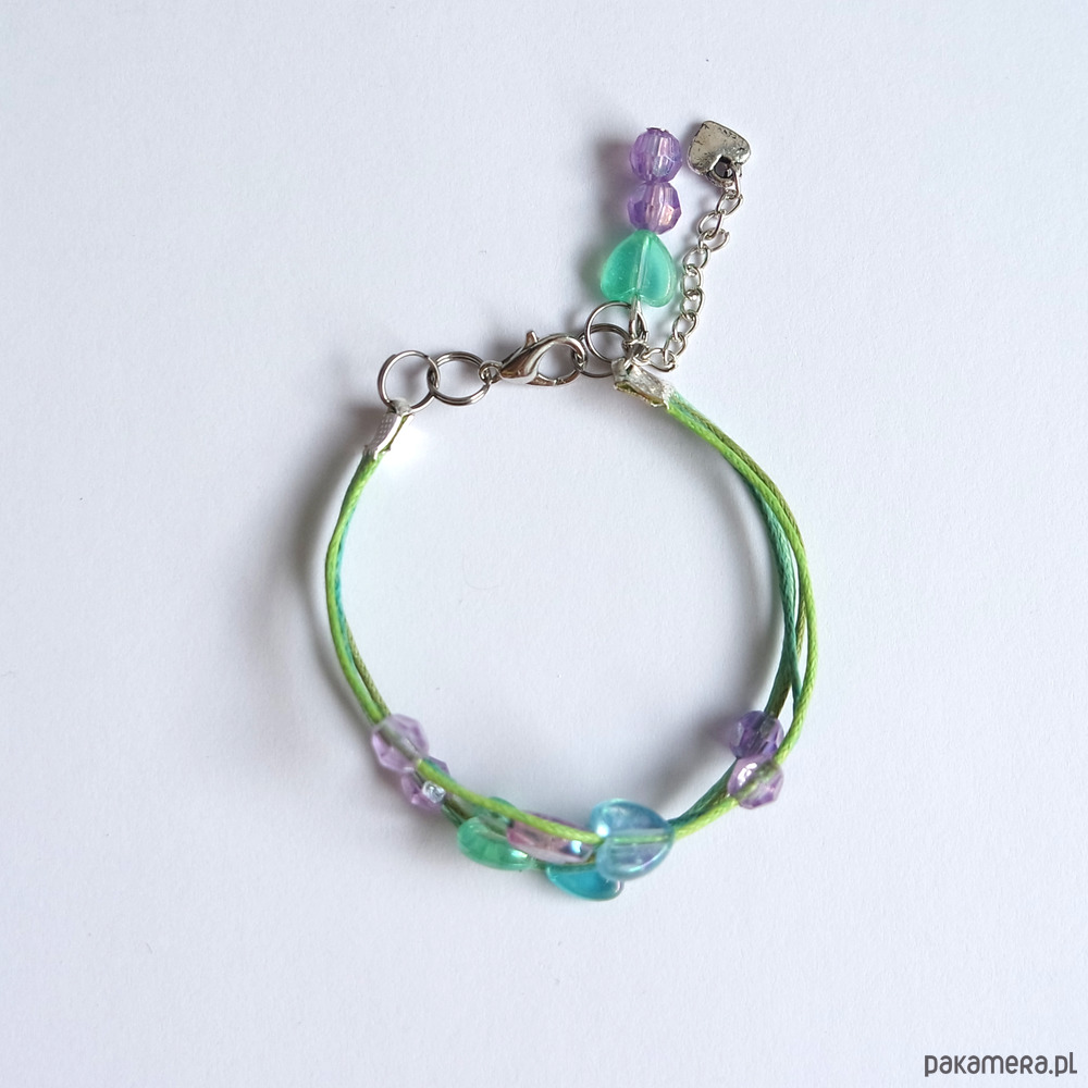 Bransoletka zrobiona jest z woskowanych sznureczków oraz koralików.