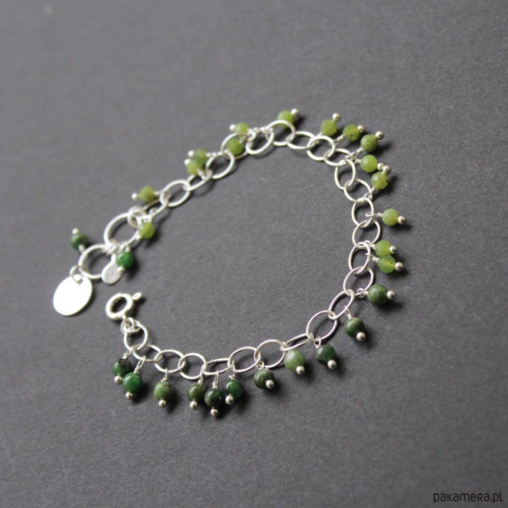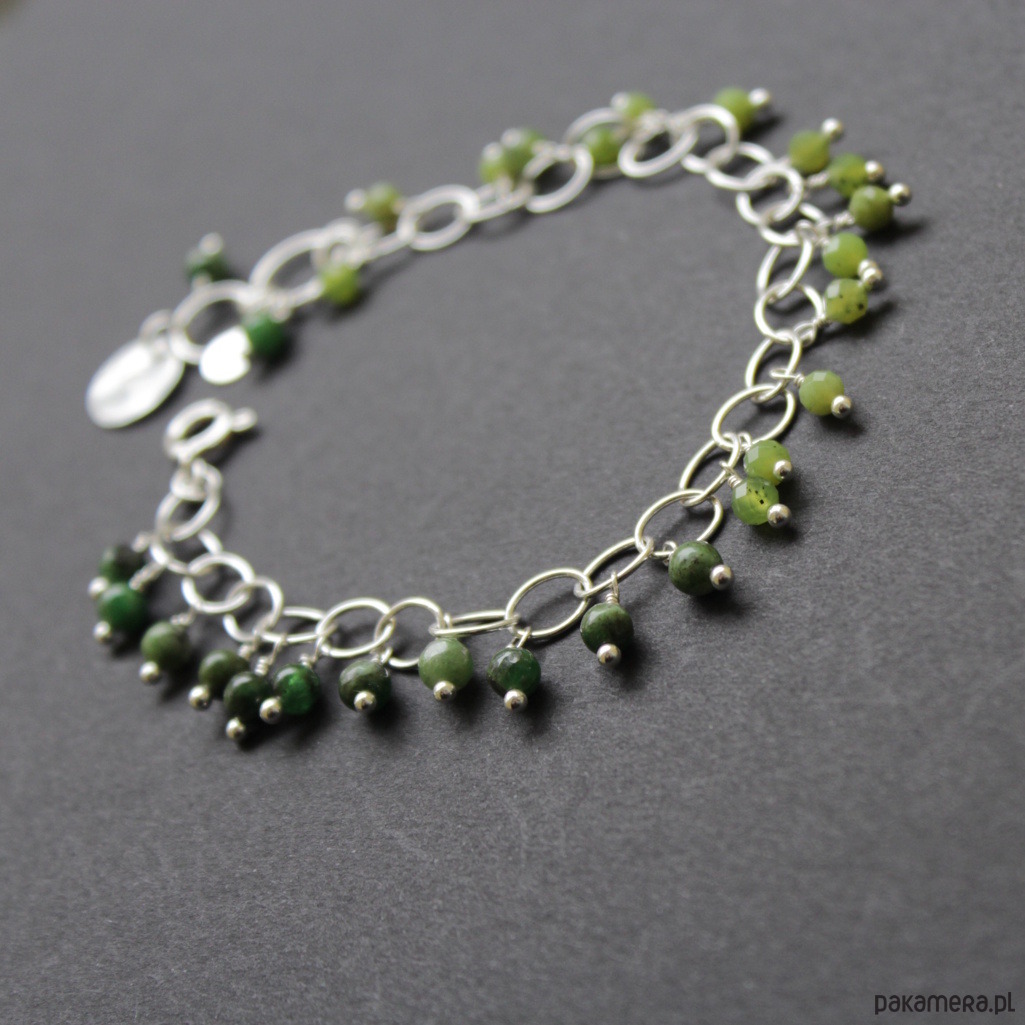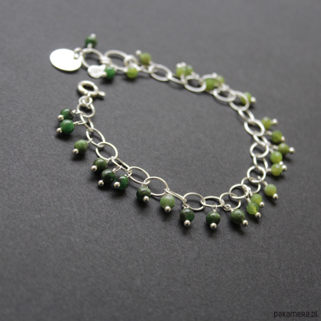 Na masywnym łańcuszku o oczkach wielkości 0,7x0,5 cm rozrzucone zostały przepiękne kuleczki zielonego diopsydu (0,5cm) oraz fasetowanego nefrytu (0,4 cm).
