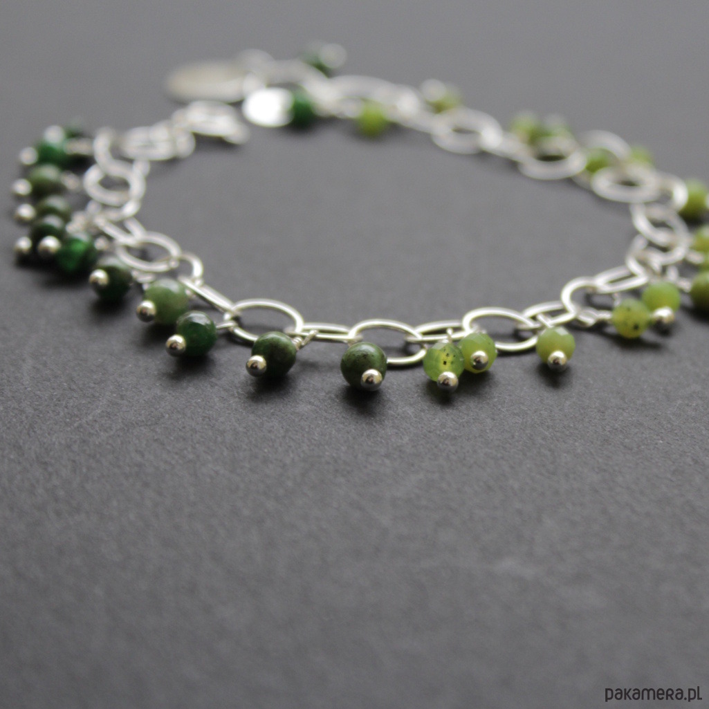 Na masywnym łańcuszku o oczkach wielkości 0,7x0,5 cm rozrzucone zostały przepiękne kuleczki zielonego diopsydu (0,5cm) oraz fasetowanego nefrytu (0,4 cm).
