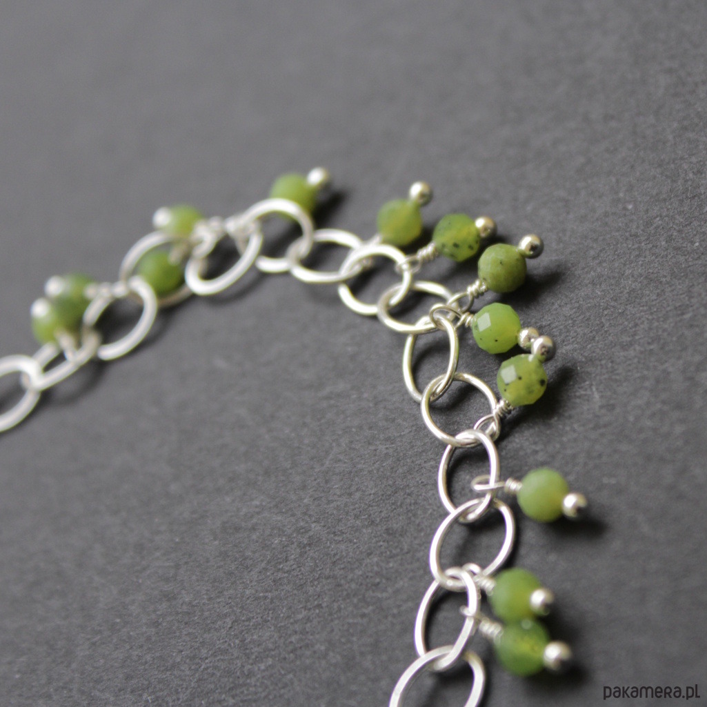 Na masywnym łańcuszku o oczkach wielkości 0,7x0,5 cm rozrzucone zostały przepiękne kuleczki zielonego diopsydu (0,5cm) oraz fasetowanego nefrytu (0,4 cm).