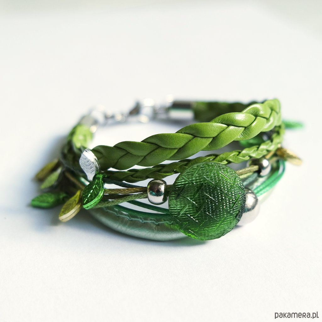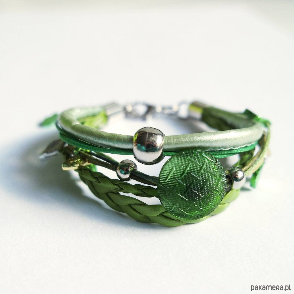 Bransoletka zrobiona jest z rzemieni ze skóry ekologicznej, sznureczków oraz guzika i koralików.