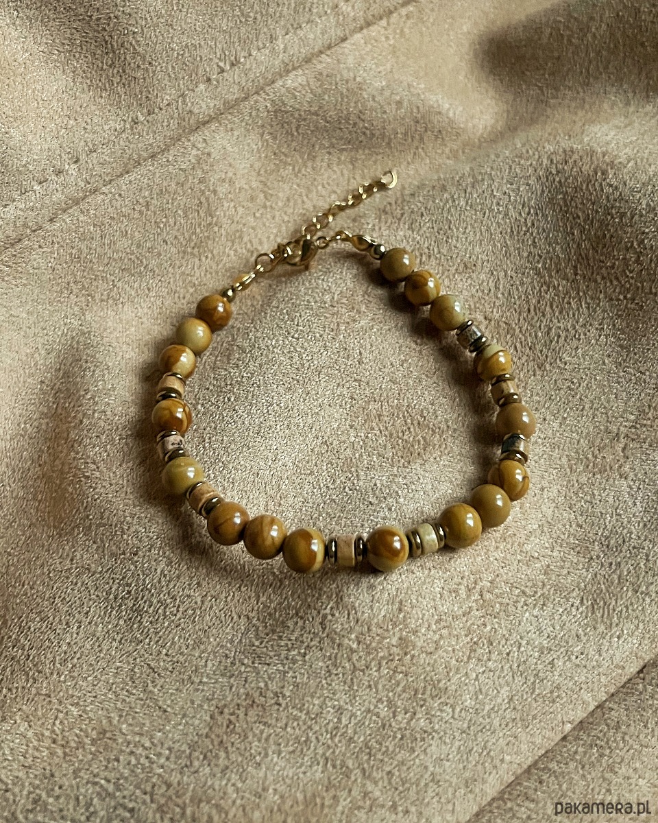 Ręcznie wykonana bransoletka z jaspisu krajobrazowego 6 mm, uzupełniona subtelnymi hematytami, tworzy harmonijną kompozycję inspirowaną kolorami ziemi.