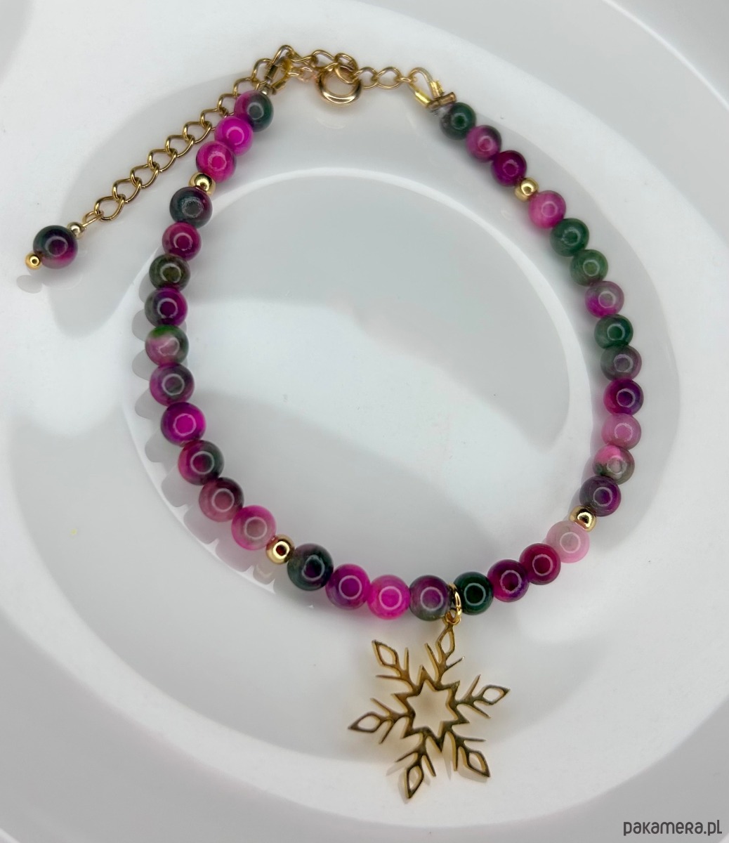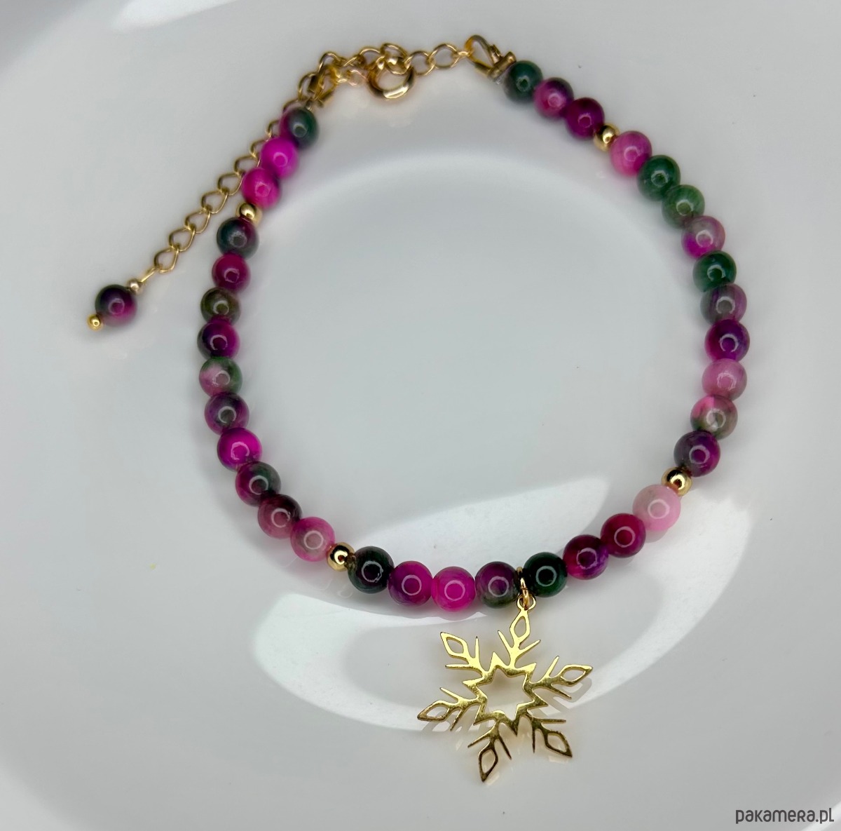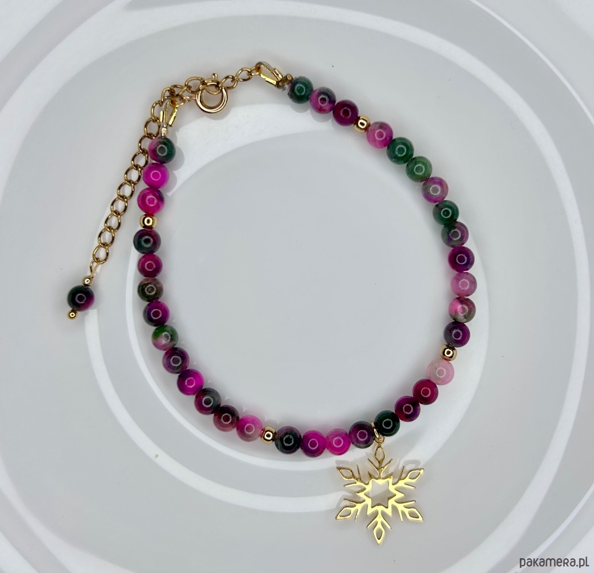 Ta urokliwa bransoletka łączy w sobie barwną energię jadeitu turmalinowego z delikatnym blaskiem złotej zawieszki w kształcie płatka śniegu (stal nierdzewna). To kompozycja, która przyciąga spojrzenia, a jednocześnie emanuje spokojem, magią i subtelną kobiecą energią.