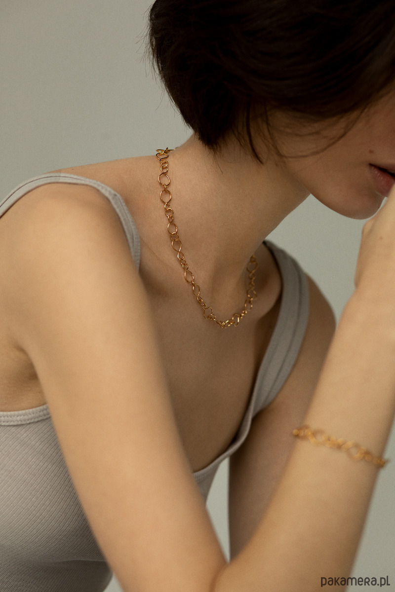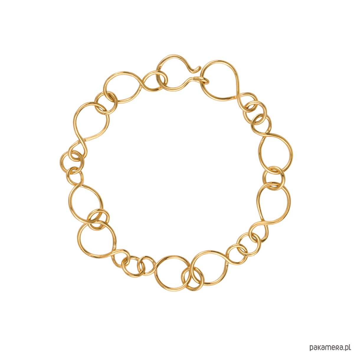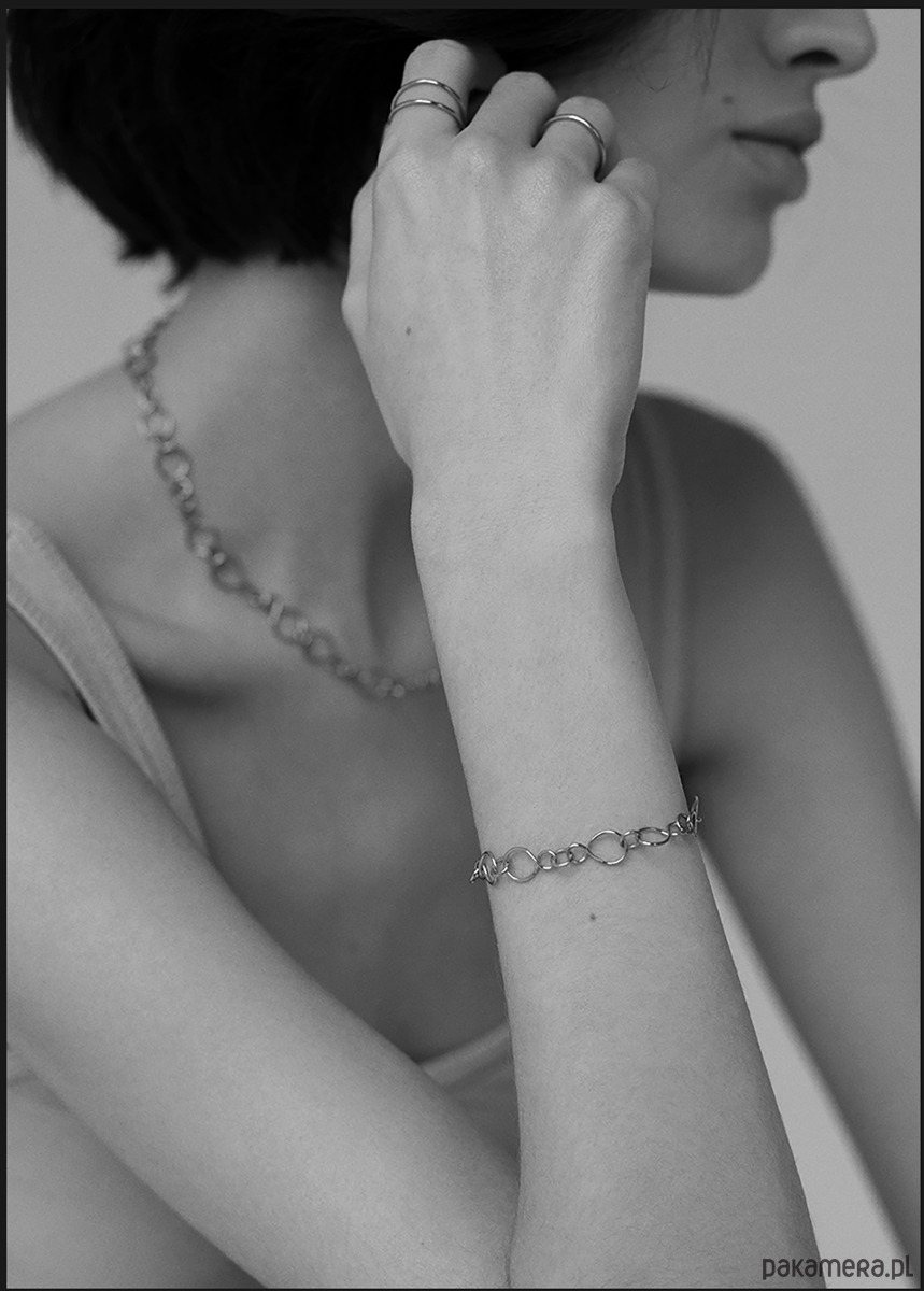 Rozgość się i poznaj pełne ciepła, czułości i naturalności "Domowe pielesze". Jedna z dwóch przeskalowanych bransoletek w dopełnieniu Domowych Pieleszy. Na jej autorski splot składają się regularnie rozmieszczone kółeczka i przewrócone ósemki - symbole nieskończoności. Ogniwa bransoletki odbijają światło przy każdym ruchu, tworząc na nadgarstku wrażenie subtelnego chaosu. Bo kto powiedział, że w “Domowych pieleszach” zawsze musi panować idealny porządek?