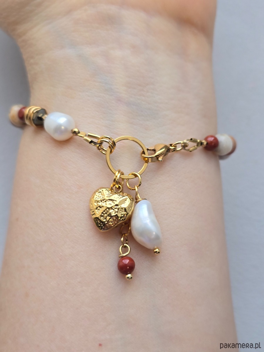 Bransoletka z zawieszkami, wykonana z kamieni naturalnych tj.: agat koronkowy, jaspis ceglasty, perły naturalne, złocony hematyt.