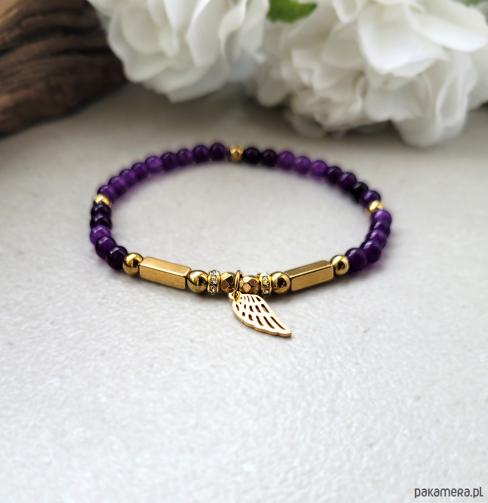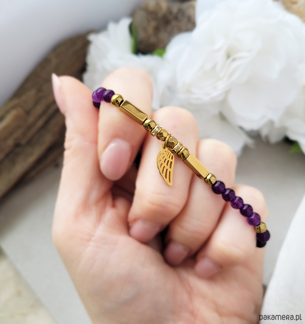Piękna bransoletka z naturalnych kamieni- Ametystu, Hematytu oraz przywieszką skrzydełkiem.