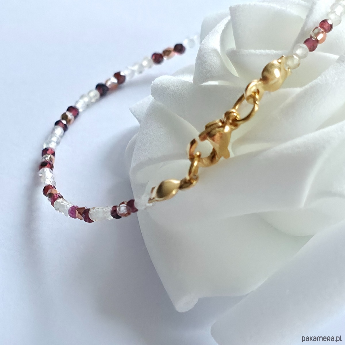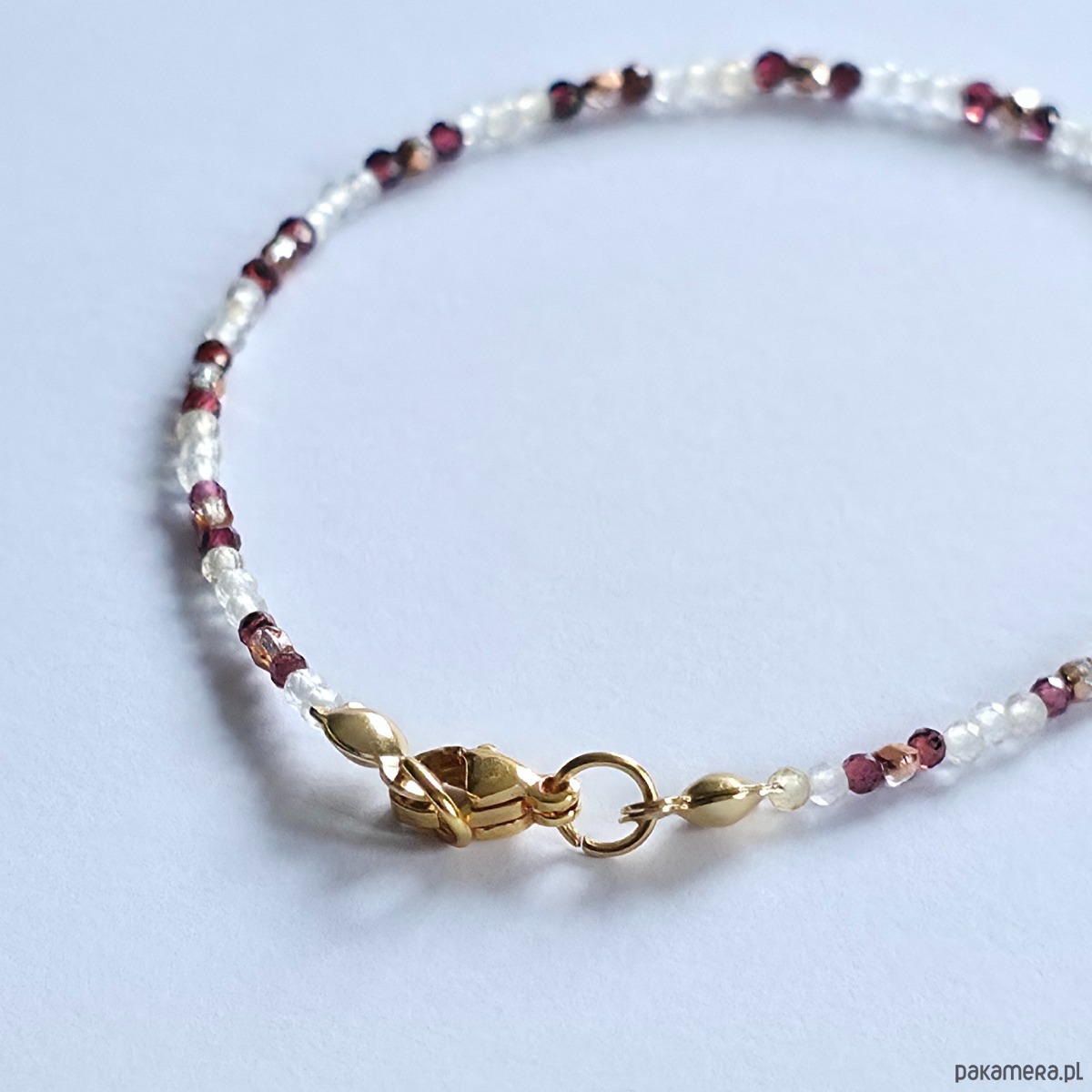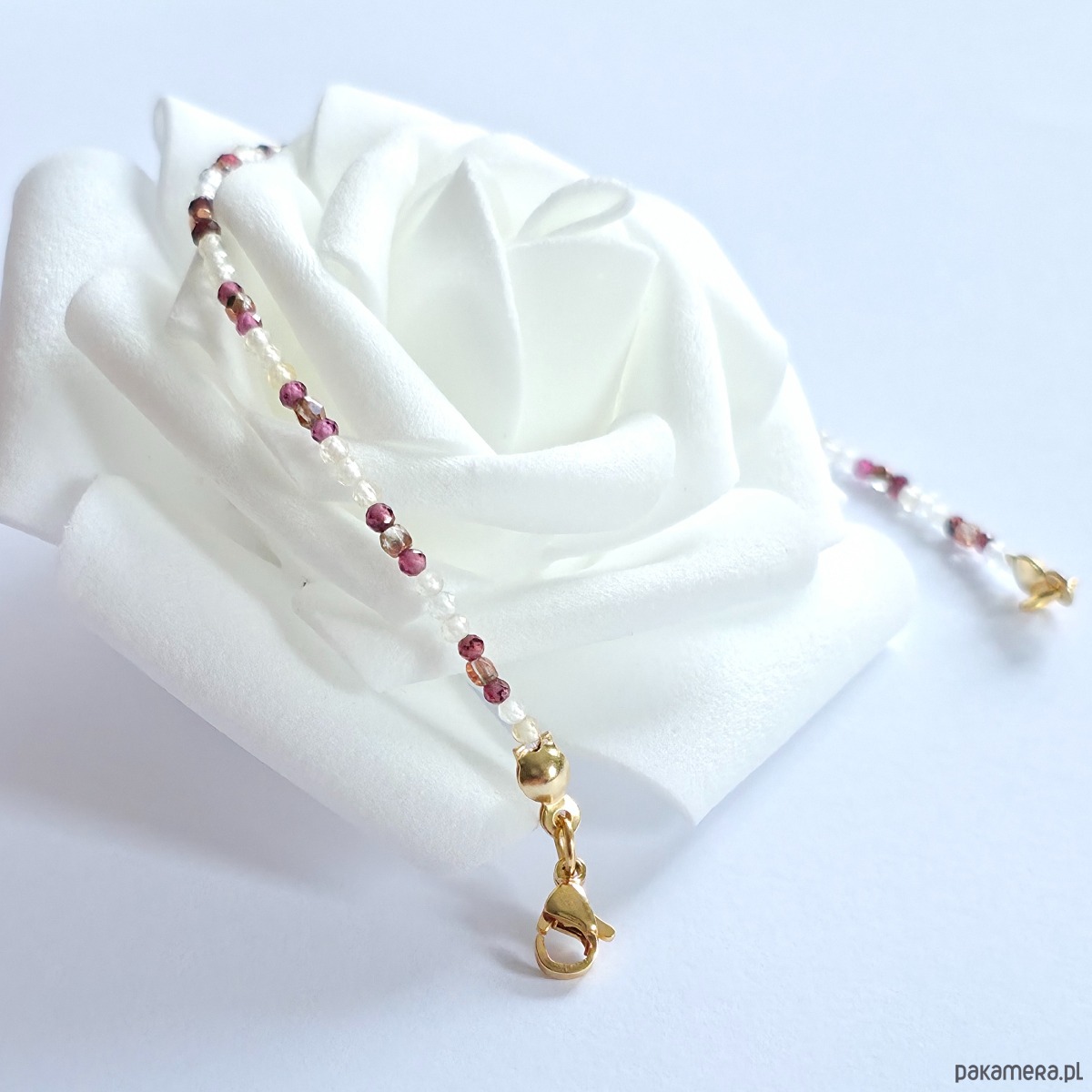 • Materiały: Granat, Cytryn, szkło Fire Polish Apollo Gold, pozłacana stal chirurgiczna, żyłka wędkarska Fluorocarbon.