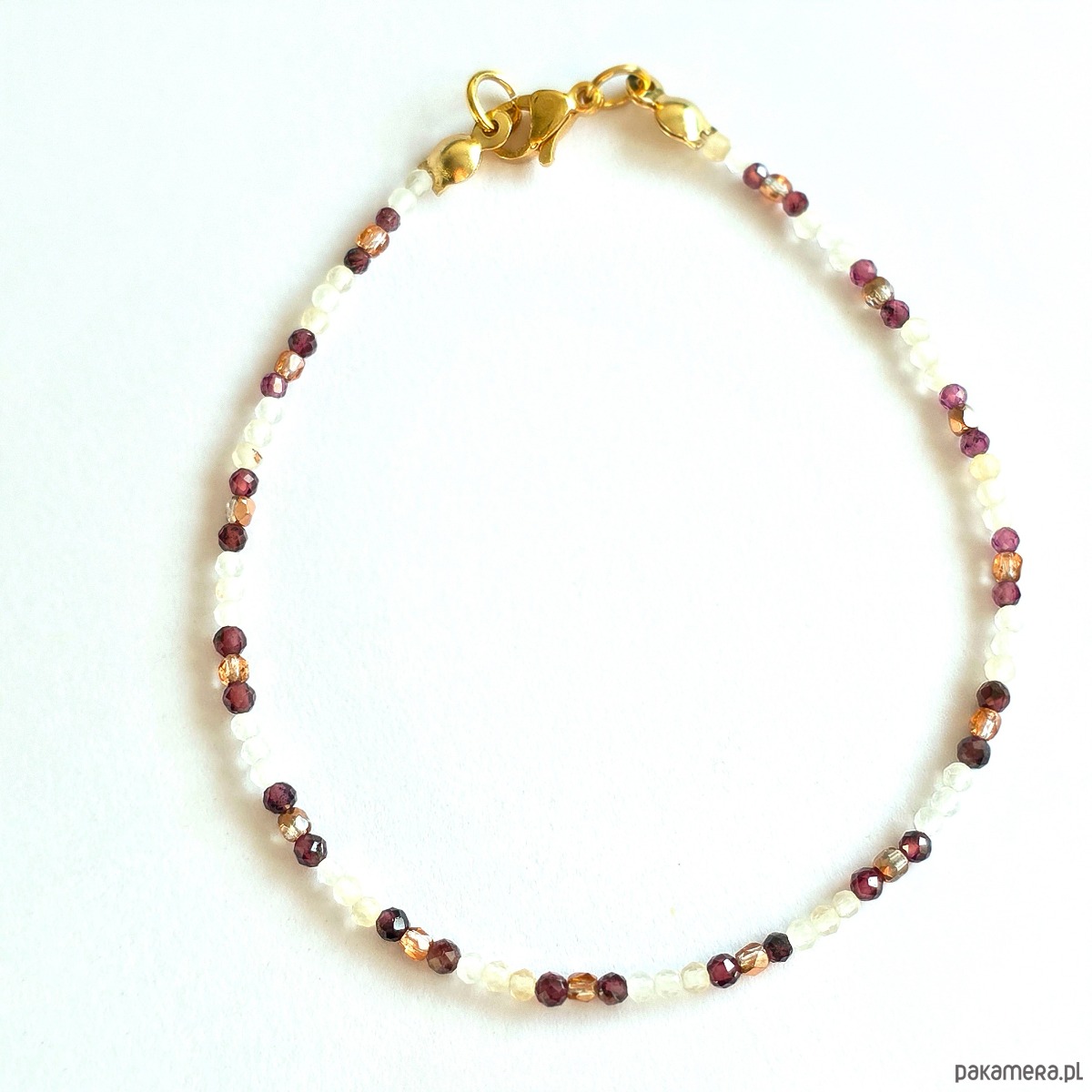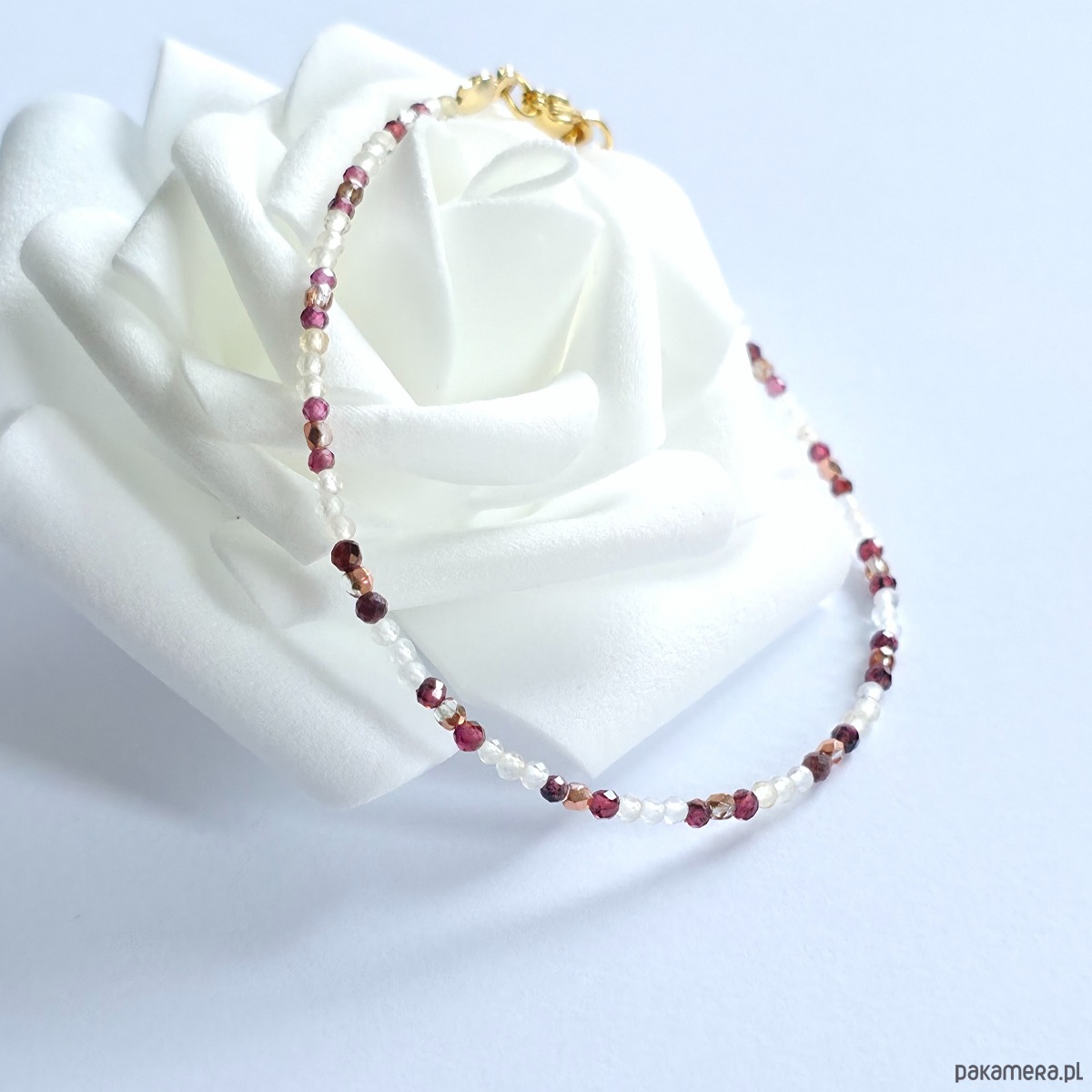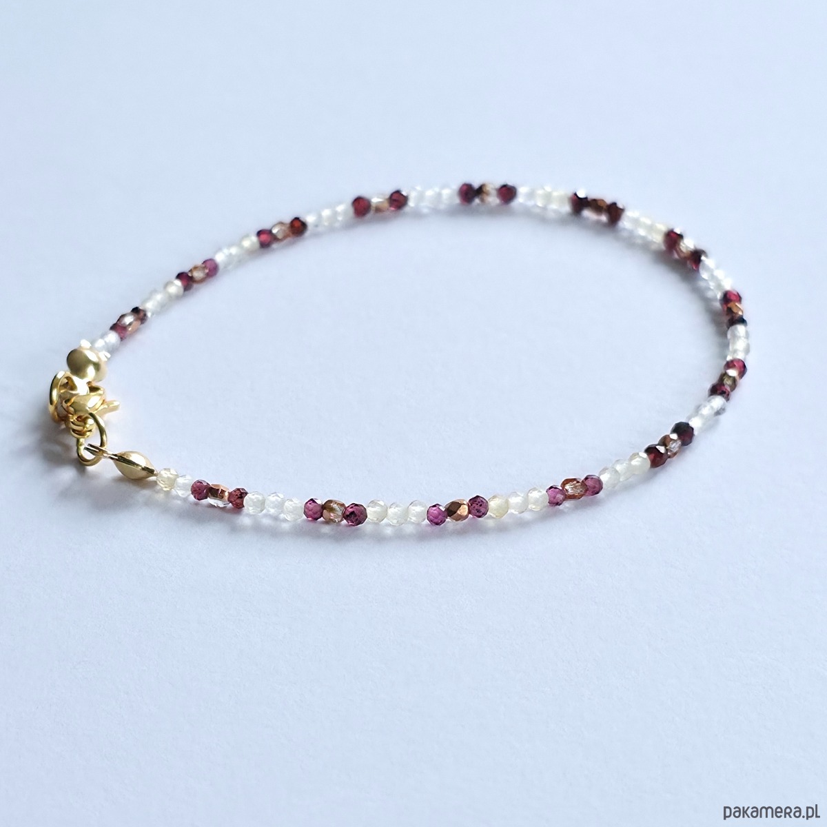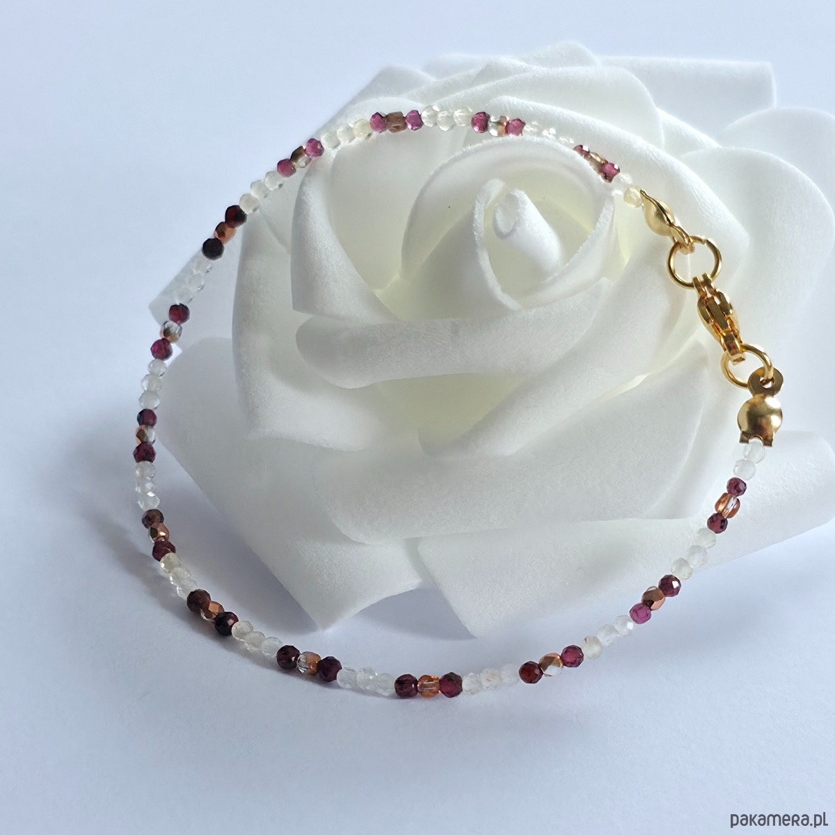 • Materiały: Granat, Cytryn, szkło Fire Polish Apollo Gold, pozłacana stal chirurgiczna, żyłka wędkarska Fluorocarbon.
