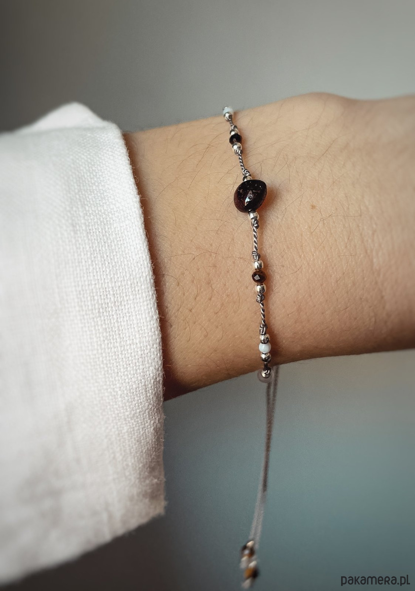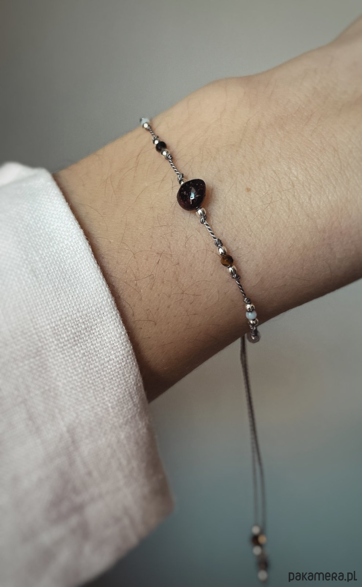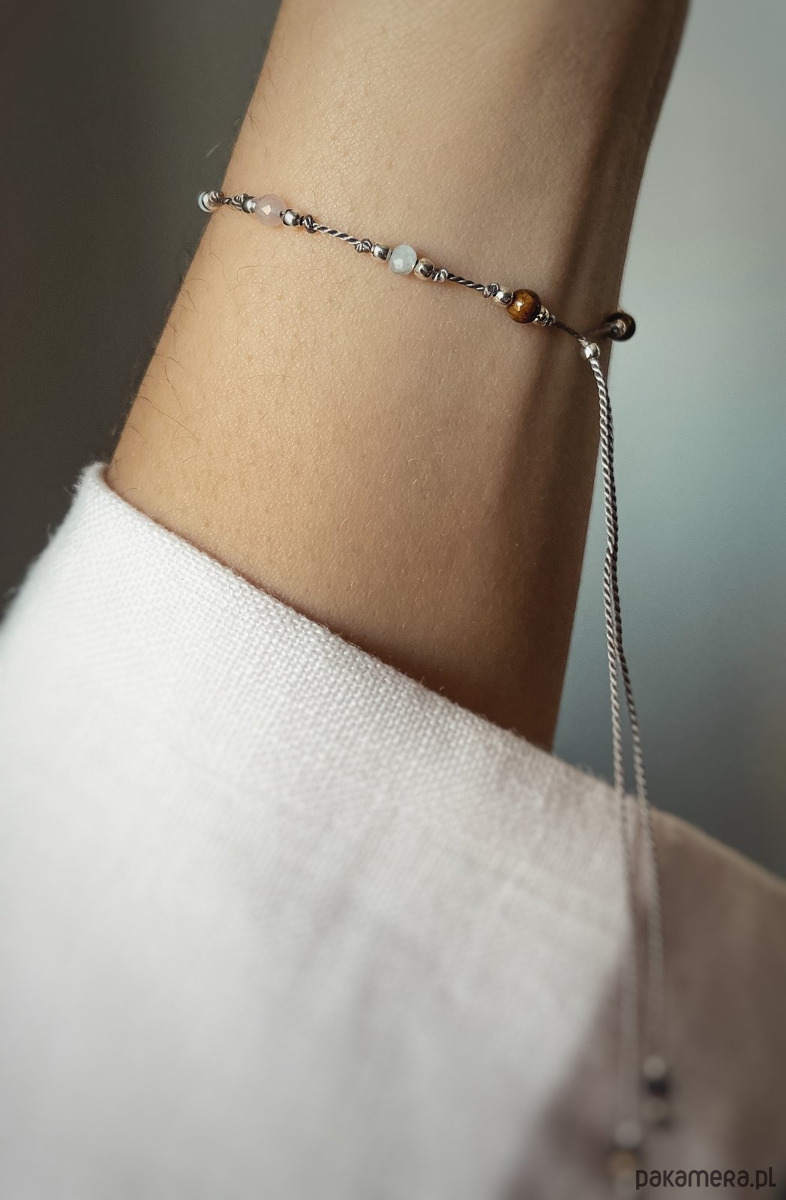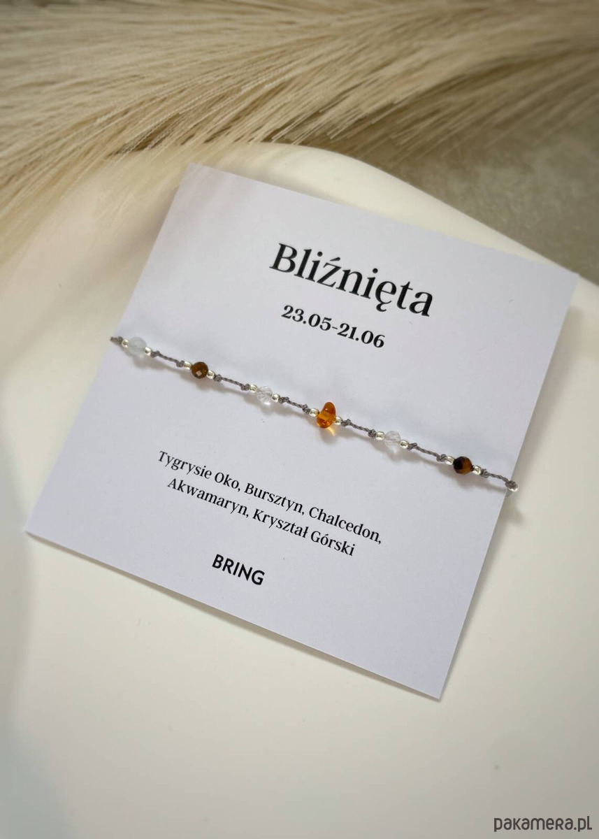 Bransoletka na mocnej, jasnej nici nylonowej z kamieniami naturalnymi, przekładana kulkami ze srebra 925. Są to kamienie odpowiednie znaku zodiaku Bliźnięta. Dodatkowo na końcach bransoletki również znajdują się kamienie naturalne z kulkami. Zestaw składa się z: