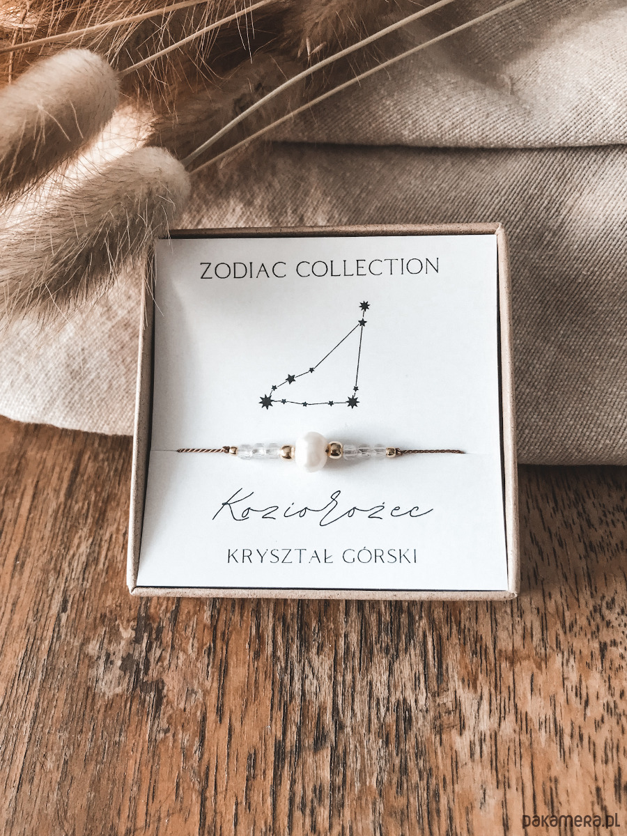 Bransoletka z kolekcji zodiakalnej dla Koziorożca. Wykonana na jedwabnej nici z kryształu górskiego, perły oraz srebrnych koralików próby 925 pozłacanych 24K złotem. Piękny przezroczysty kamień kryształu górskiego to propozycja delikatnej i subtelnej biżuterii.