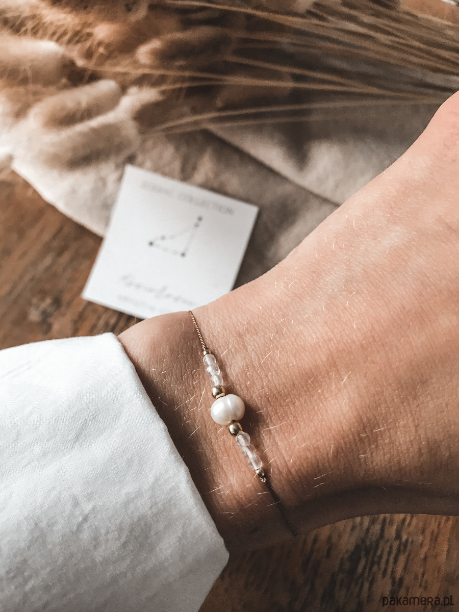 Bransoletka z kolekcji zodiakalnej dla Koziorożca. Wykonana na jedwabnej nici z kryształu górskiego, perły oraz srebrnych koralików próby 925 pozłacanych 24K złotem. Piękny przezroczysty kamień kryształu górskiego to propozycja delikatnej i subtelnej biżuterii.