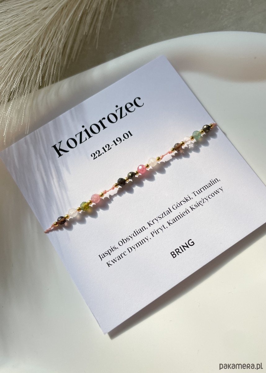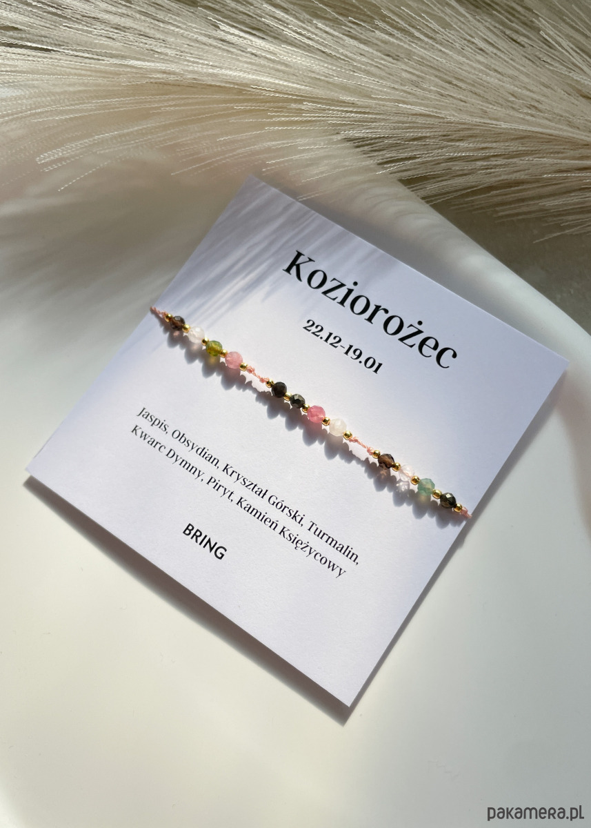Bransoletka stworzona poprzez połączenie pięknej, jasnej nici nylonowej, z niesamowitymi kamieniami naturalnymi, przekładanymi pozłacanymi kuleczkami ze srebra próby 925. Na jej końcach znajdziemy również kamienie naturalne oraz pozłacane kuleczki. Są to kamienie odpowiednie znaku zodiaku Koziorożec. Zestaw składa się z: