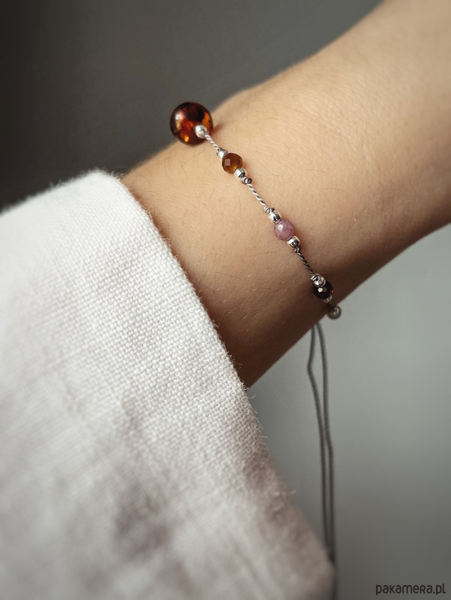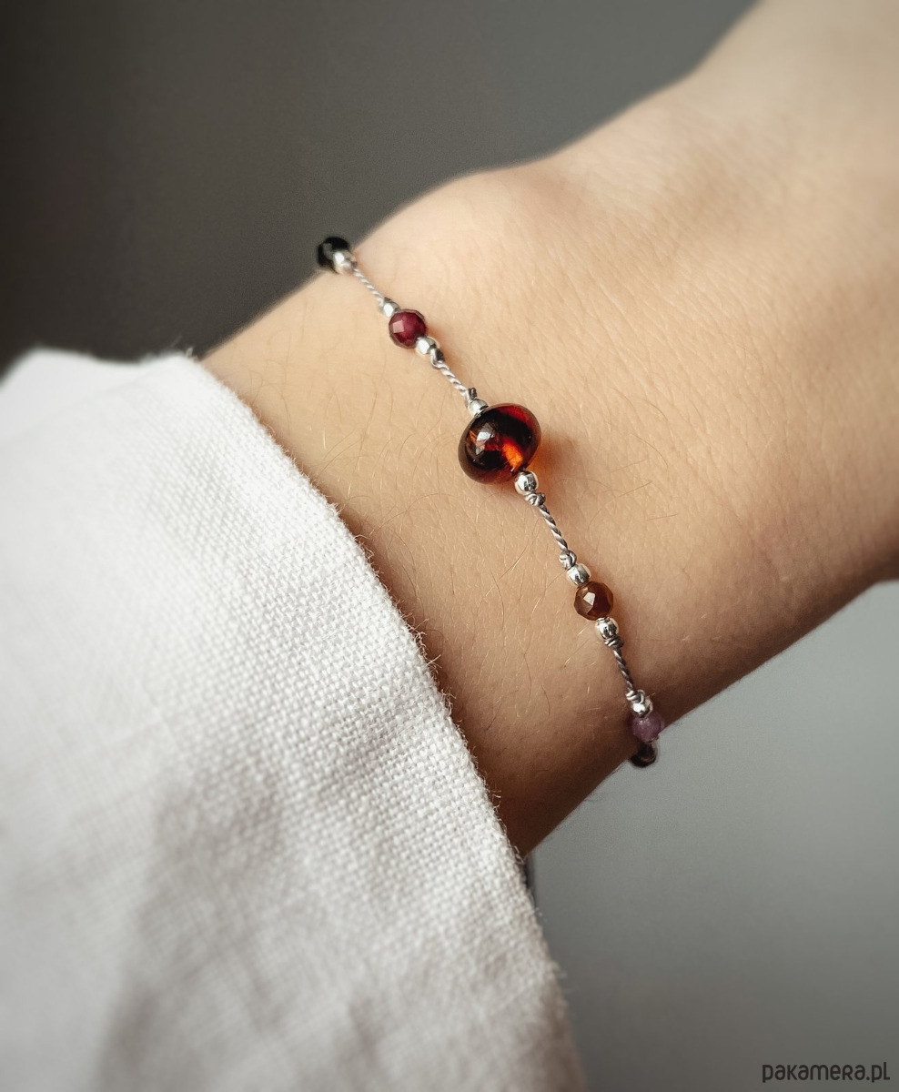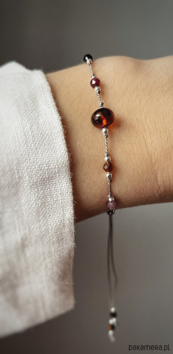 1) Bransoletki na nici z kamieniami naturalnymi (kryształ górski, tygrysie oko, bursztyn, granat, rubin, noc kairu, spinel)