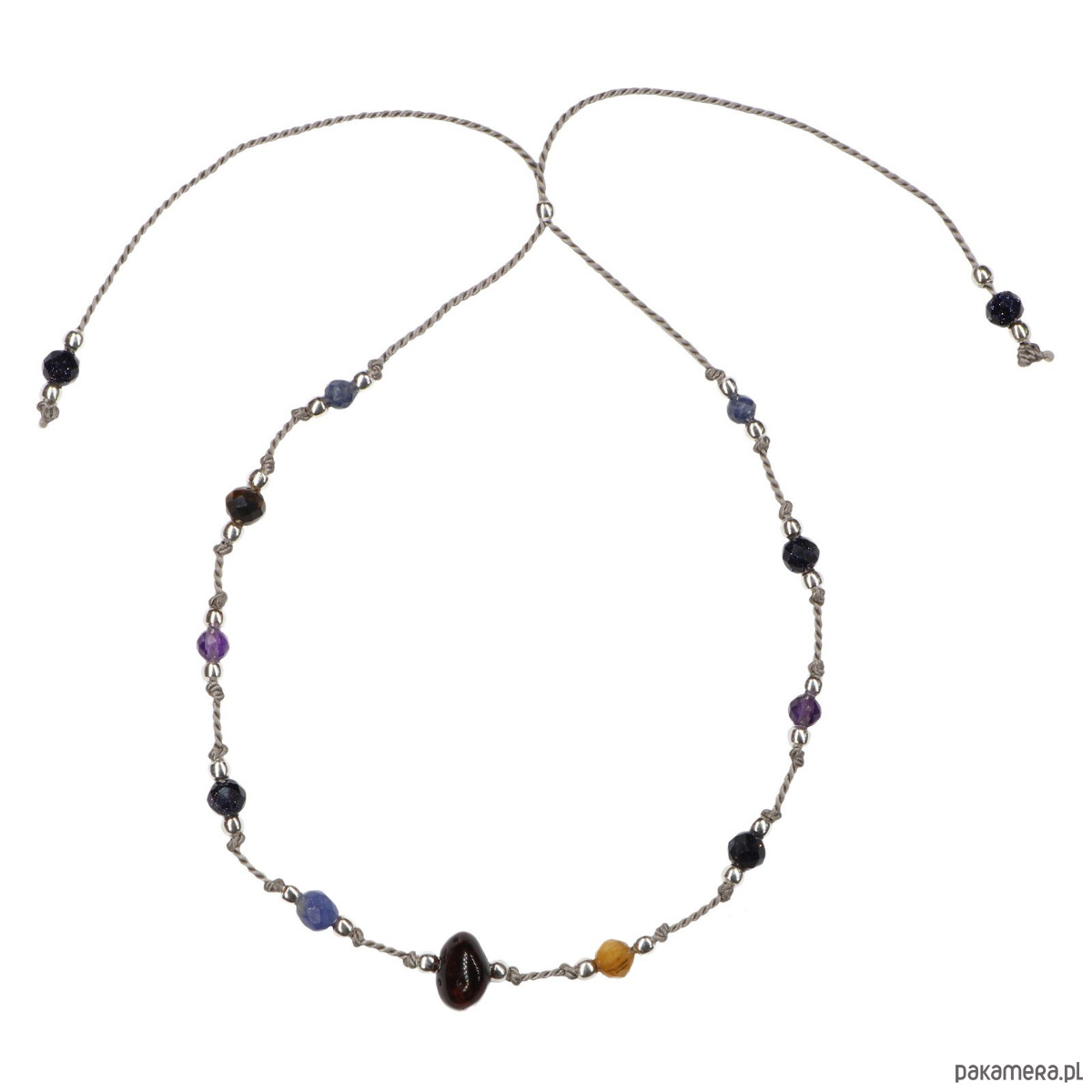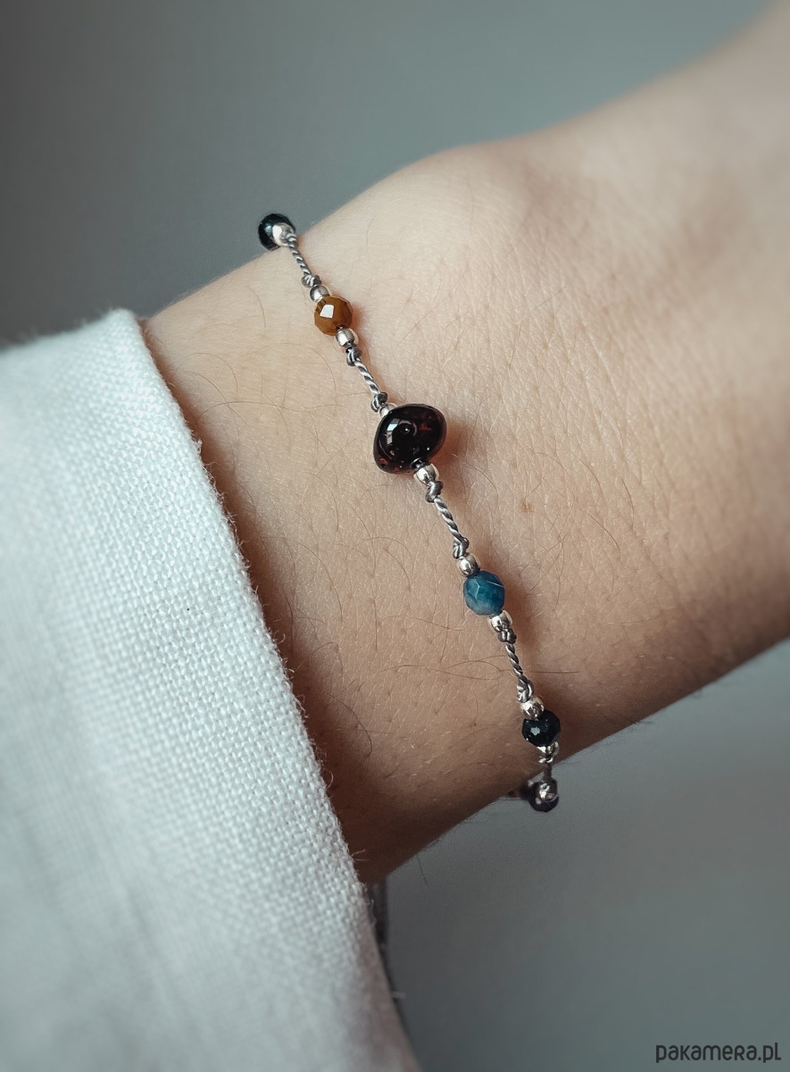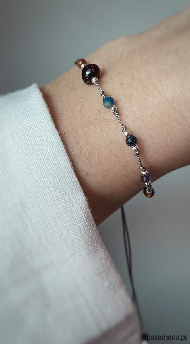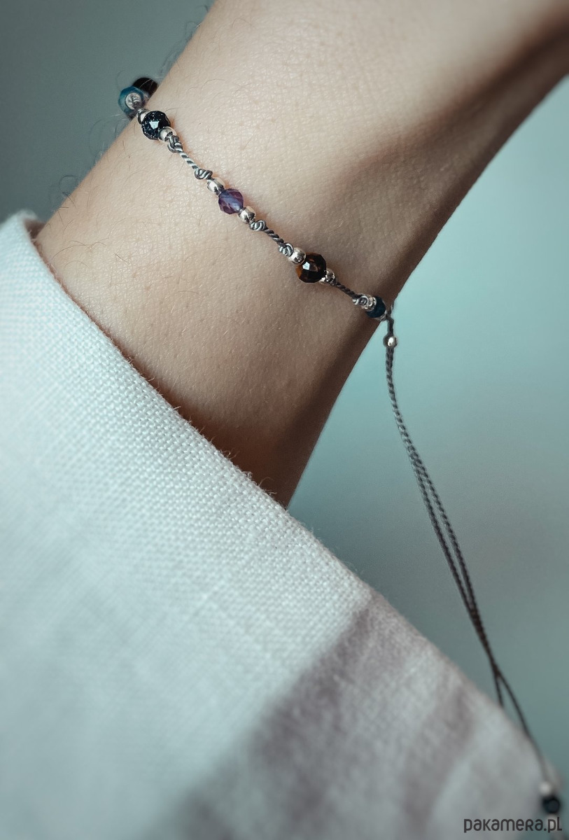Jest to piękny i niesamowicie przebojowy pomysł nie tylko na prezent. Zachwyci niejedną osobę. Jest to piękne połączenie niesamowicie wytrzymałej nici nylonowej z błyszczącymi kamieniami naturalnymi, przekładanymi srebrnymi elementami. Dzięki dodaniu srebrnej kuleczki z tyłu łatwo możemy samodzielnie regulować długość bransoletki, co powoduje, że będzie idealnie pasować na każdą rękę. Całość wykonywana jest własnoręcznie, przez co produkt ma niesamowicie wysoką jakość.