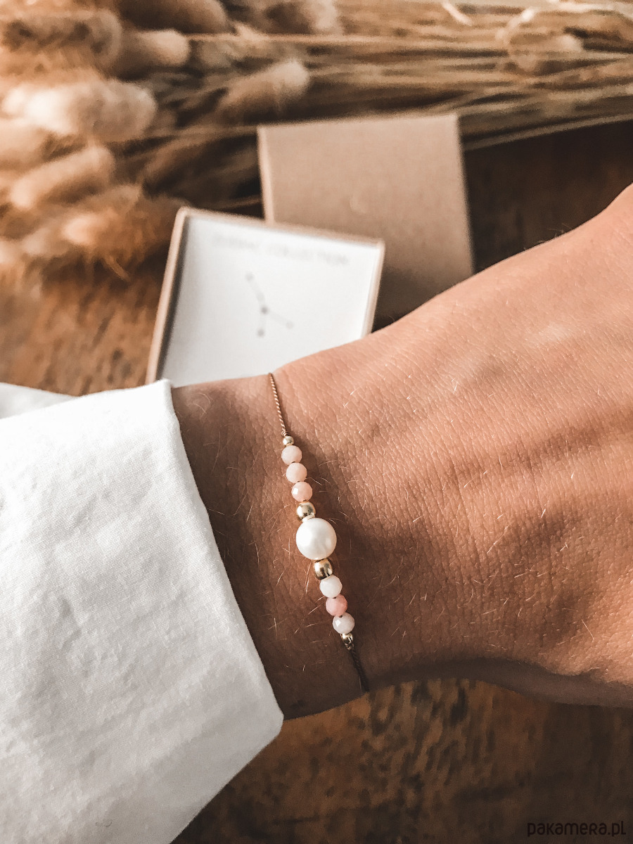 Bransoletka z kolekcji zodiakalnej dla Raka. Wykonana na jedwabnej nici z opalu, perły oraz srebrnych koralików próby 925 pozłacanych 24K złotem. Piękny różowy kolor opalu to propozycja delikatnej i subtelnej biżuterii.