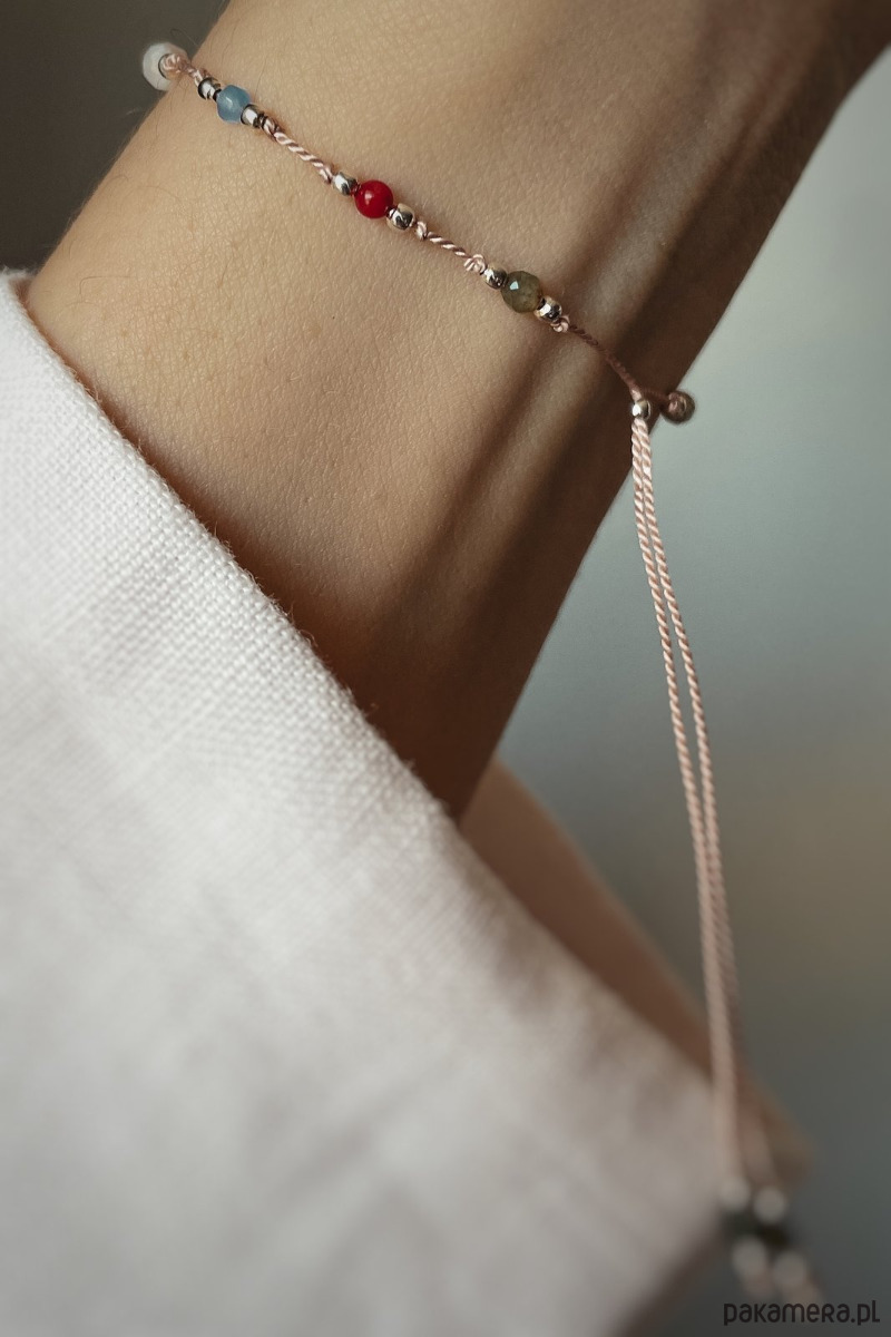Bransoletka na trwałej, niezawodnej nici nylonowej z kamieniami naturalnymi, przekładana kulkami ze srebra próby 925. Są to kamienie odpowiednie znaku zodiaku Rak. Bransoletka jest zakończona również kamieniami naturalnymi i kulkami. Zestaw składa się z: