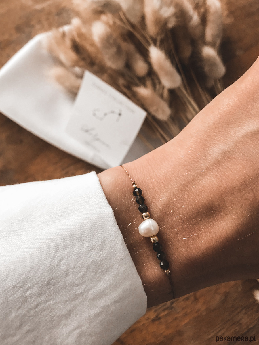 Bransoletka z kolekcji zodiakalnej dla Skorpiona. Wykonana na jedwabnej nici z obsydianu, perły oraz srebrnych koralików próby 925 pozłacanych 24K złotem. Piękny ciemnozielony kolor obsydianu to propozycja eleganckiej i subtelnej biżuterii.