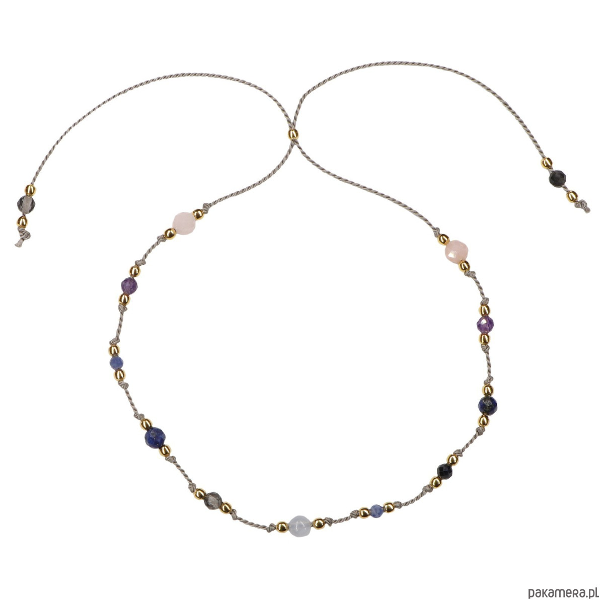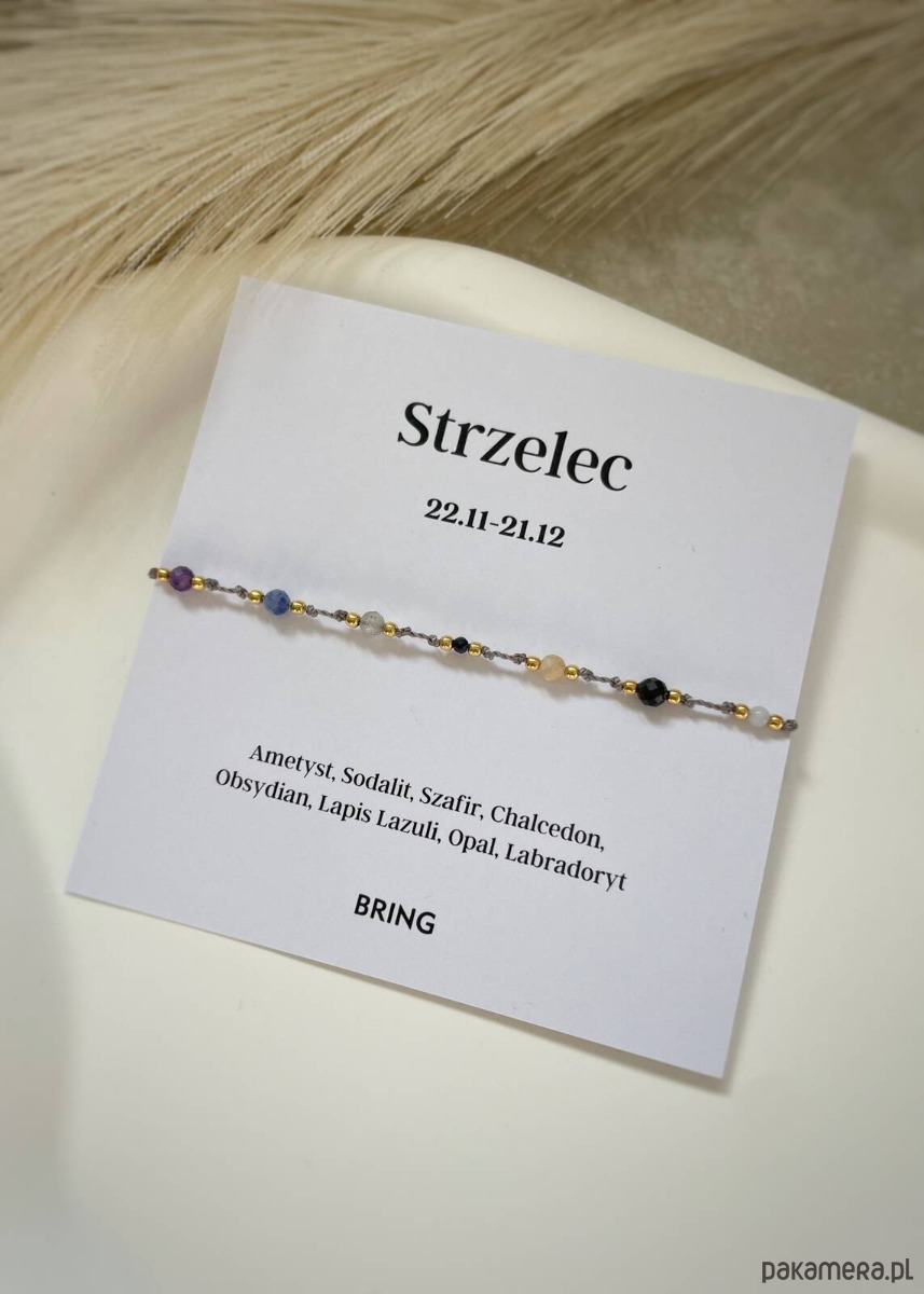 Bransoletka na delikatnej i jednocześnie niesamowicie wytrzymałej nici nylonowej o jasnym kolorze z dodatkiem kamieni naturalnych oraz pozłacanych kuleczek ze srebra próby 925. Na jej końcach również znajdują się kamienie naturalne oraz kulki. Są to kamienie odpowiednie znaku zodiaku Strzelec. Zestaw składa się z: