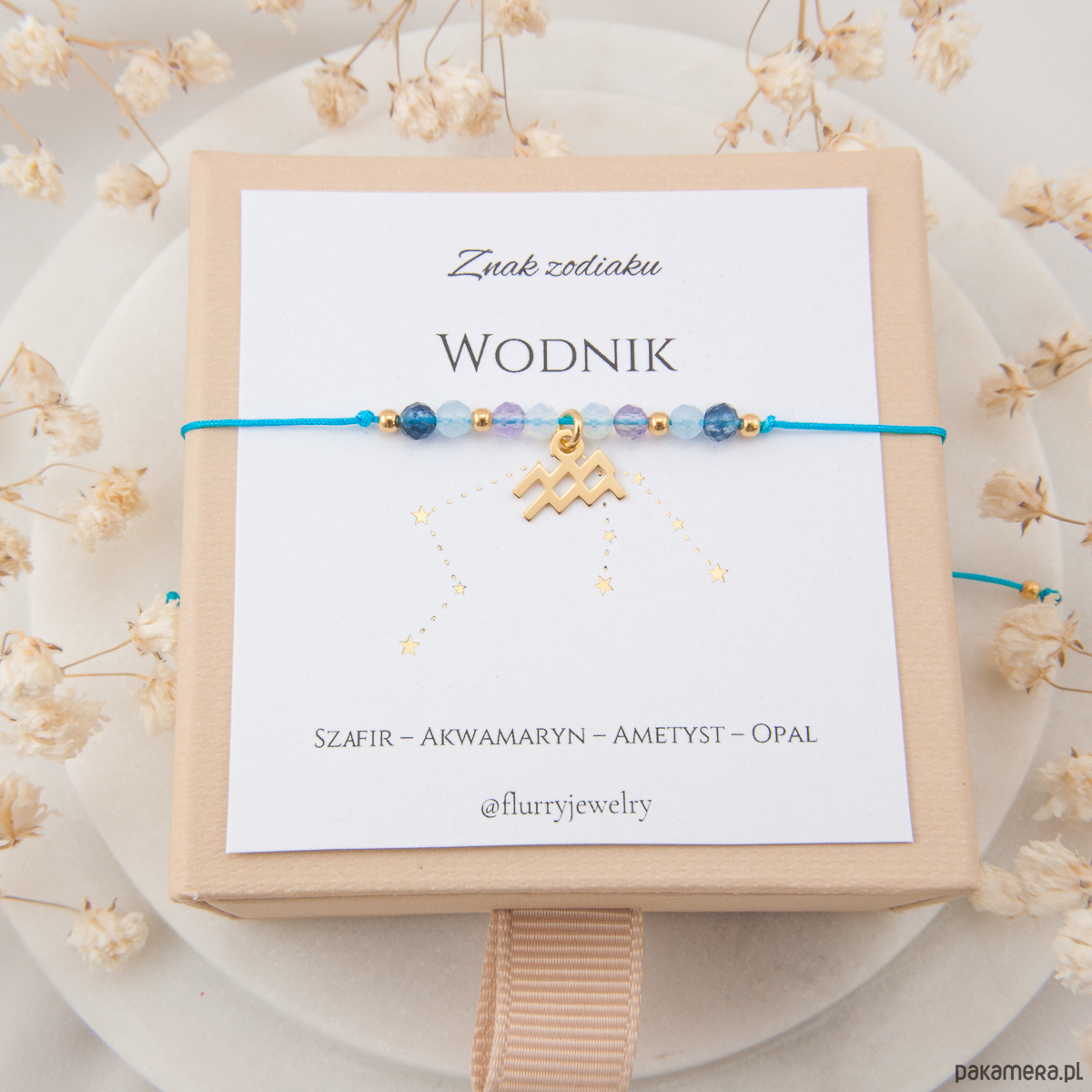W astrologii wyróżniany 12 znaków zodiaku, które odpowiadają układom gwiazd na niebie w dniach urodzenia każdego z nas. Każdemu znakowi zodiaku przypisuje się specyficzne cechy charakteru, słabe i mocne strony, osobowość czy predyspozycje. Każdy ma swój szczęśliwy kamień i kolor. Biżuteria ze znakiem zodiaku to idealny prezent dla bliskiej Ci osoby, przyniesie szczęścia i ochronę na co dzień. Bransoletka ma dołączone kamienie zodiakalne dla wodnika.