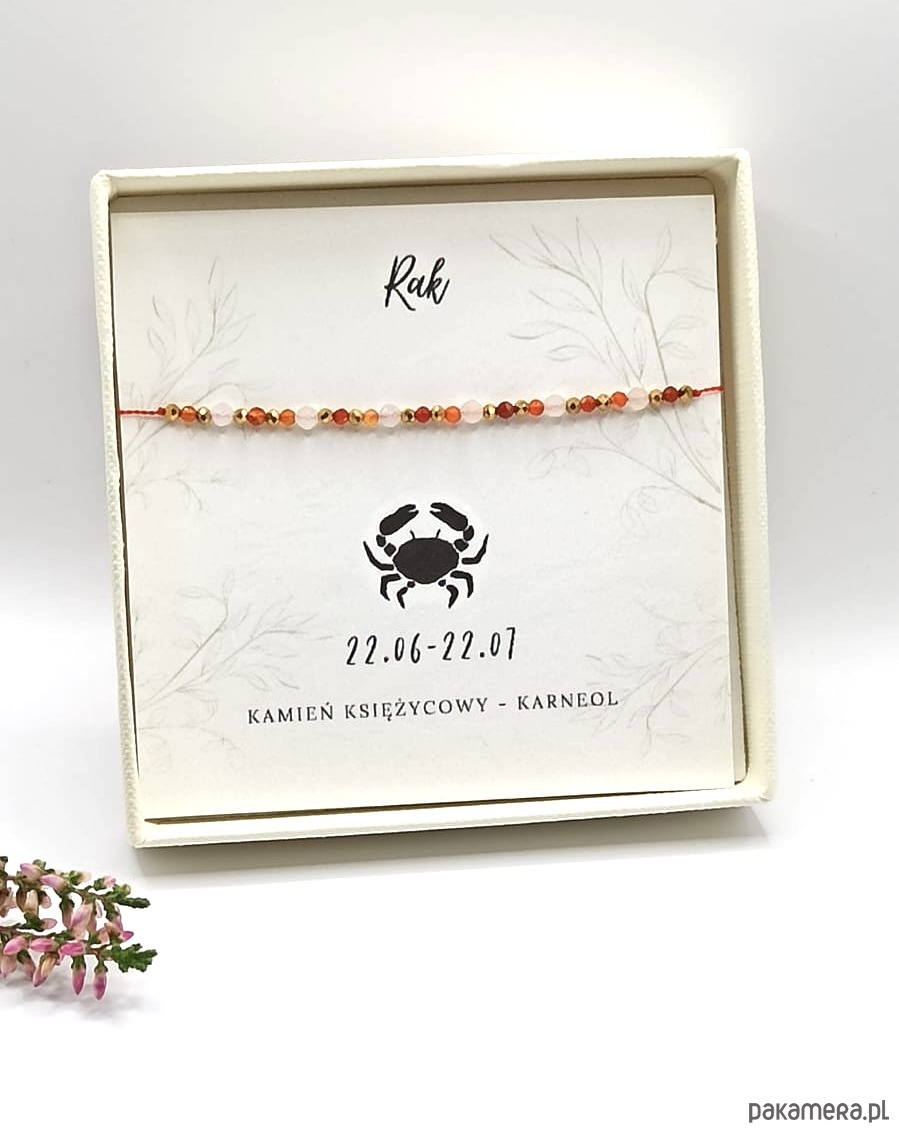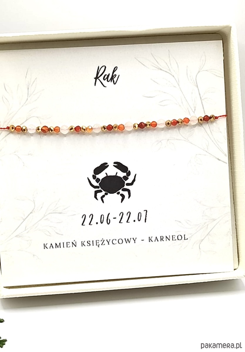 Delikatna bransoletka z kamieni dla Raka. Drobny, kobiecy dodatek. Lekko układa się na ręce, wygodne zapięcie na sznureczku pozwala dopasować bransoletkę do rozmiaru nadgarstka.