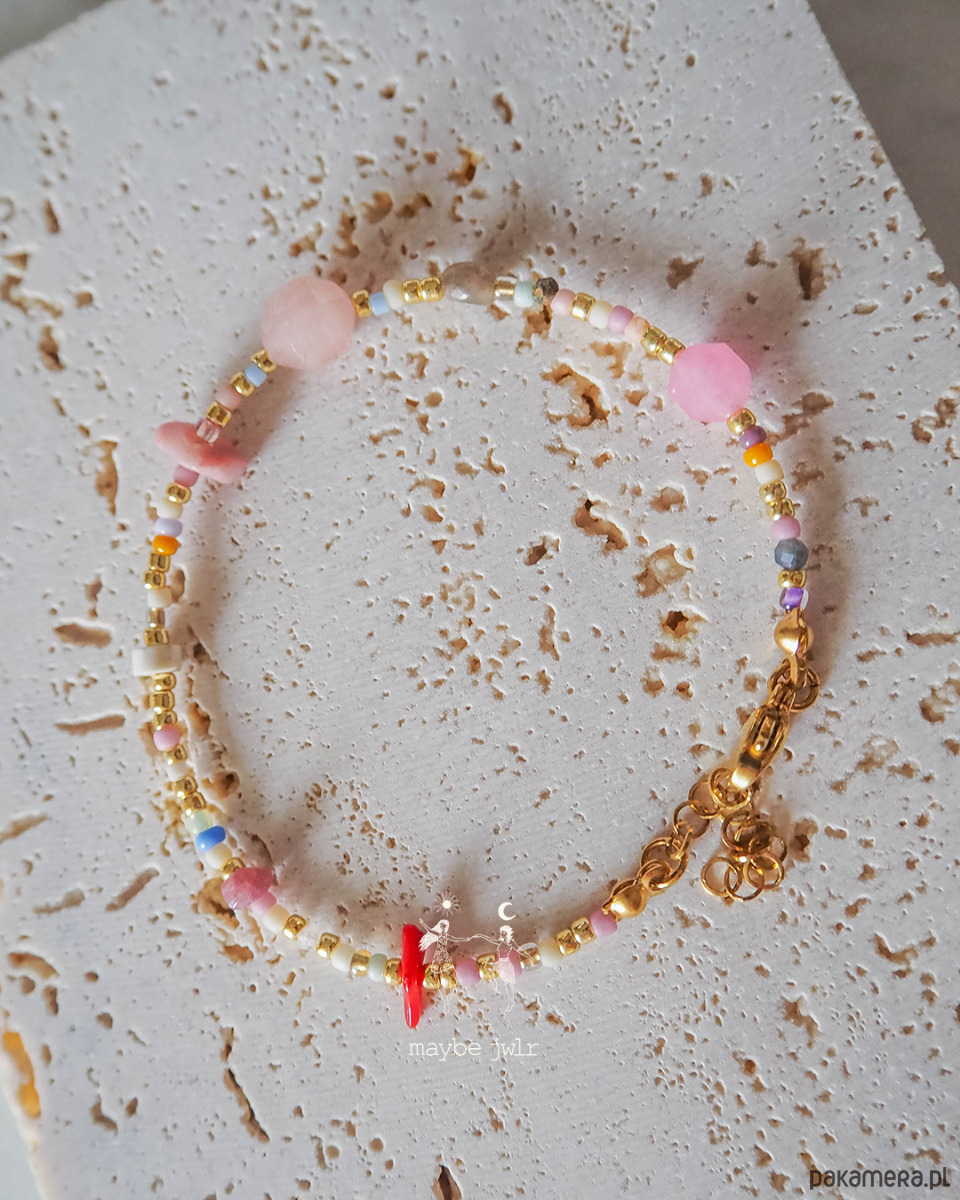 Kamienie: kamień słoneczny, kwarc truskawkowy, howlit, koral, rodochrozyt, turmalin, rodonit