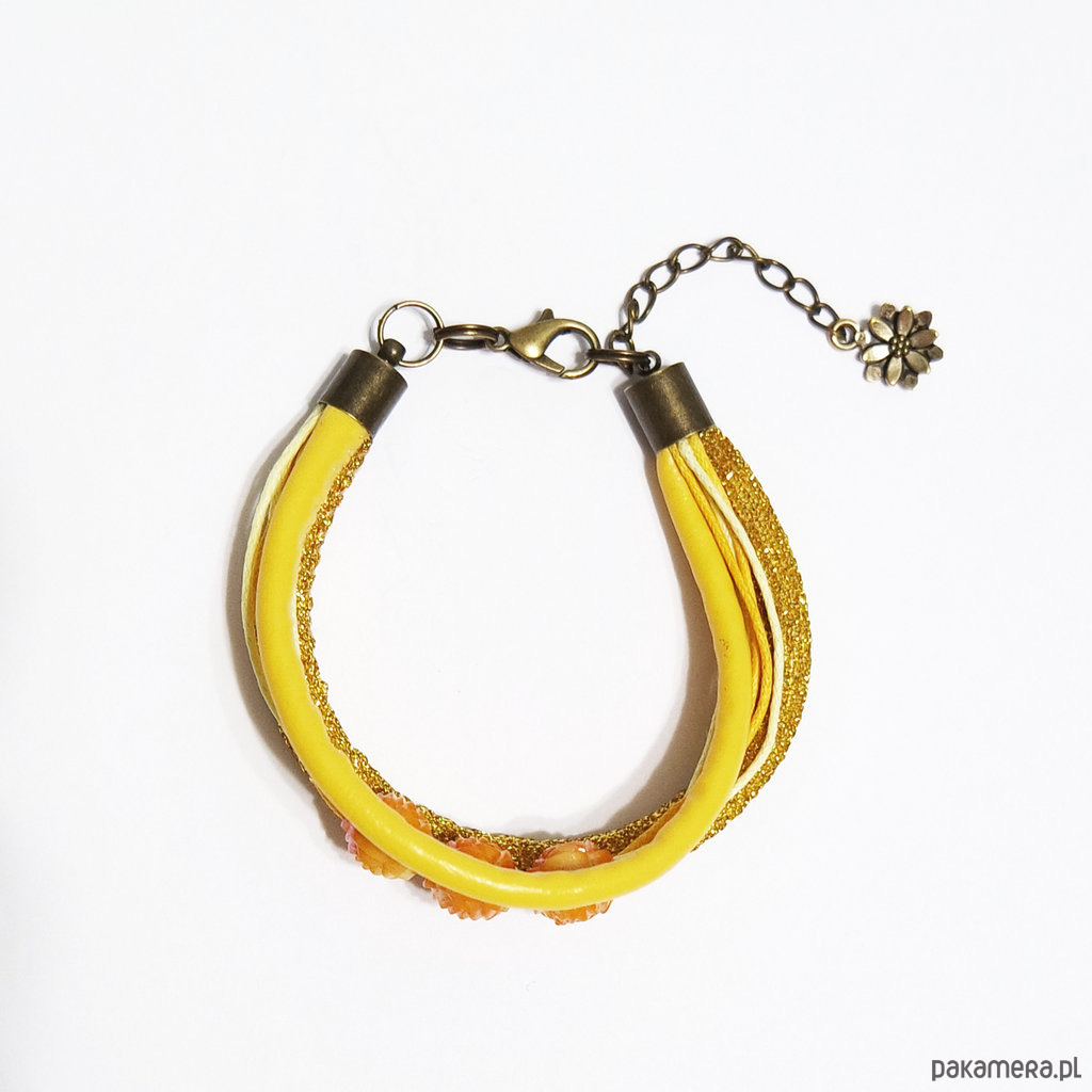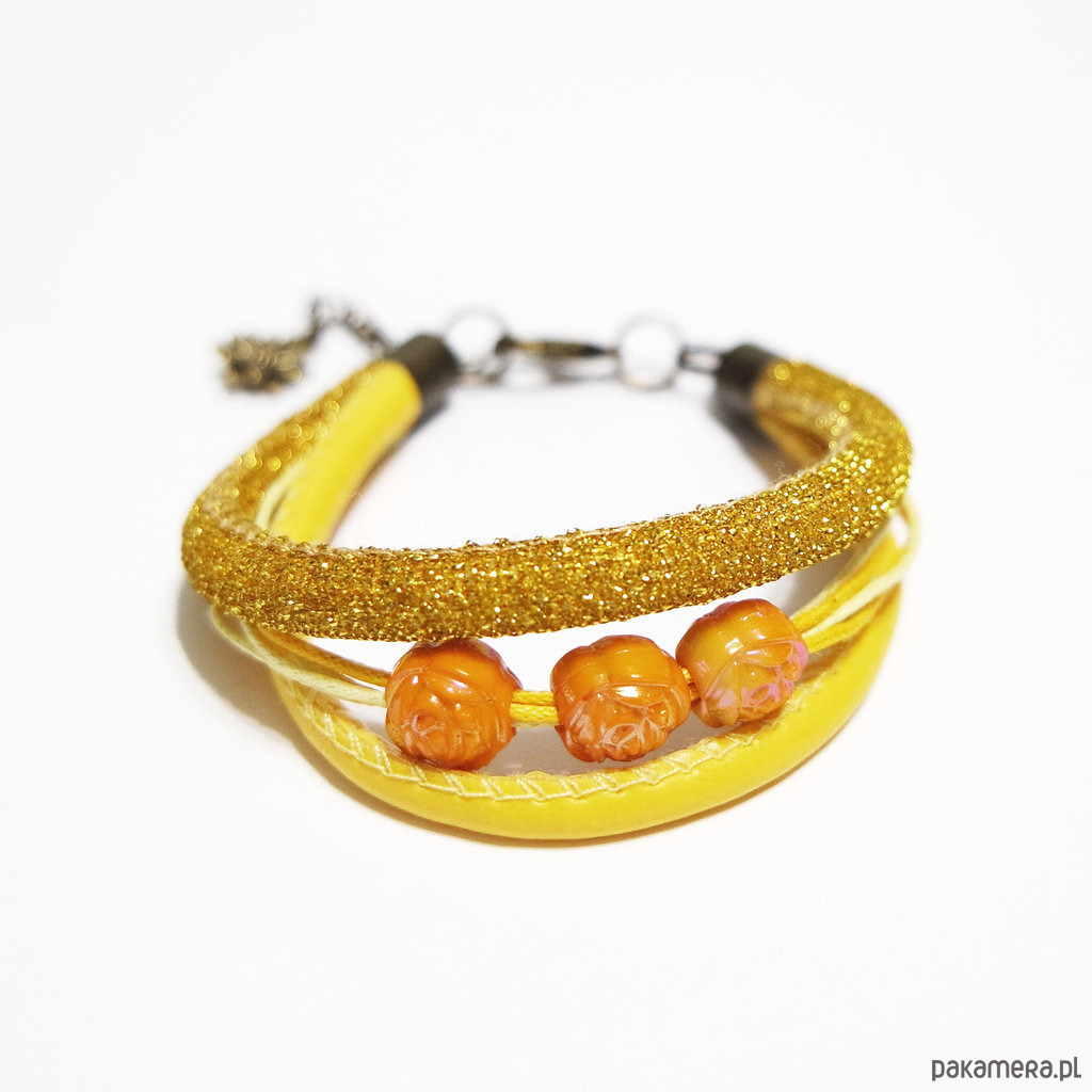Bransoletka zrobiona jest z rzemieni ze skóry ekologicznej, materiału, sznurka oraz akrylowych koralików.