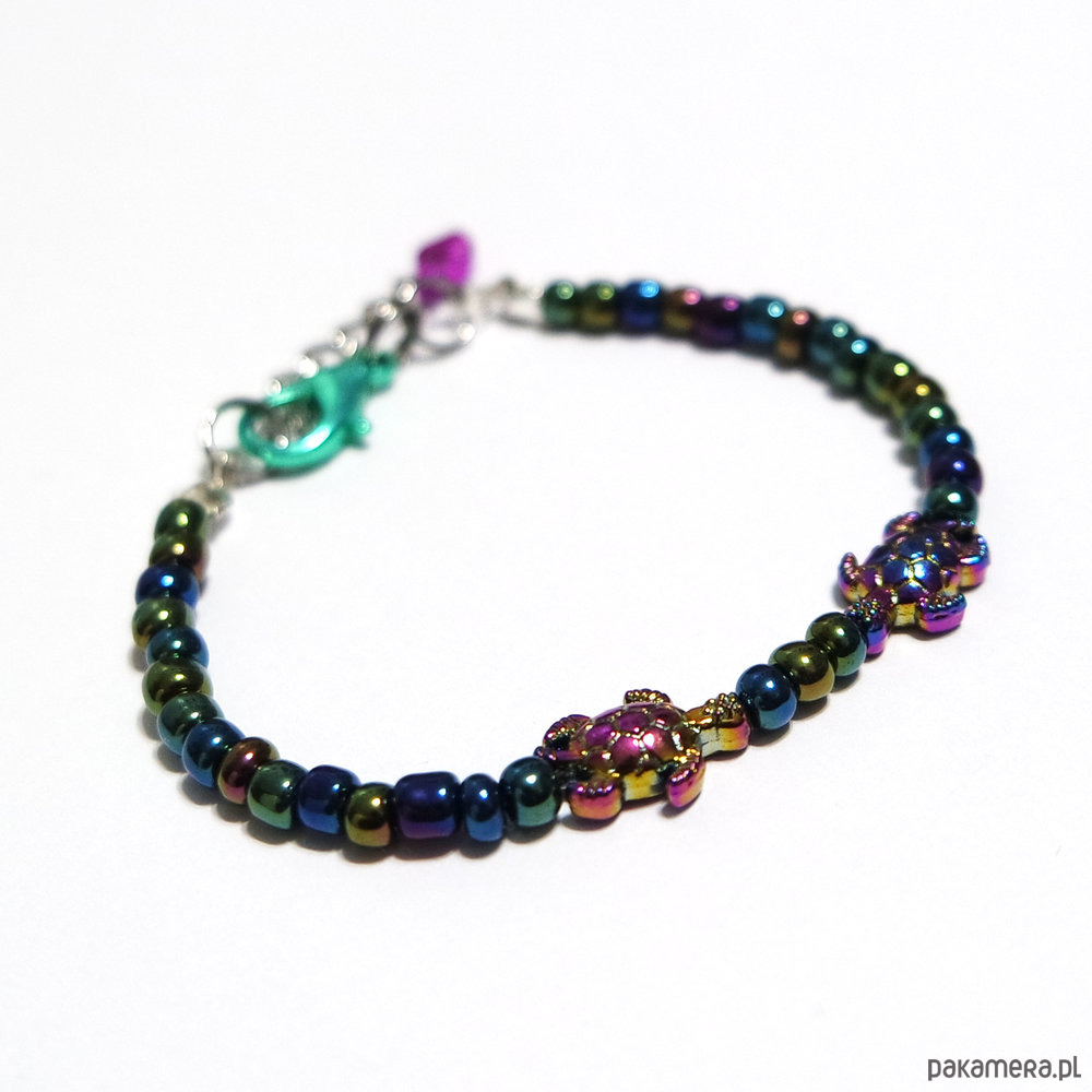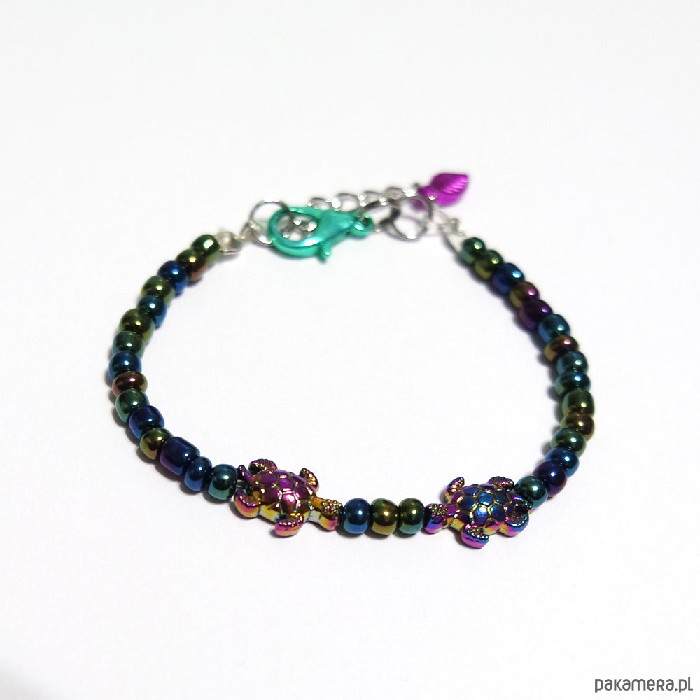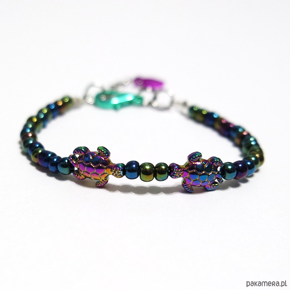 Oryginalna bransoletka z przekładkami w kształcie żółwi wykonanych ze stali szlachetnej.
