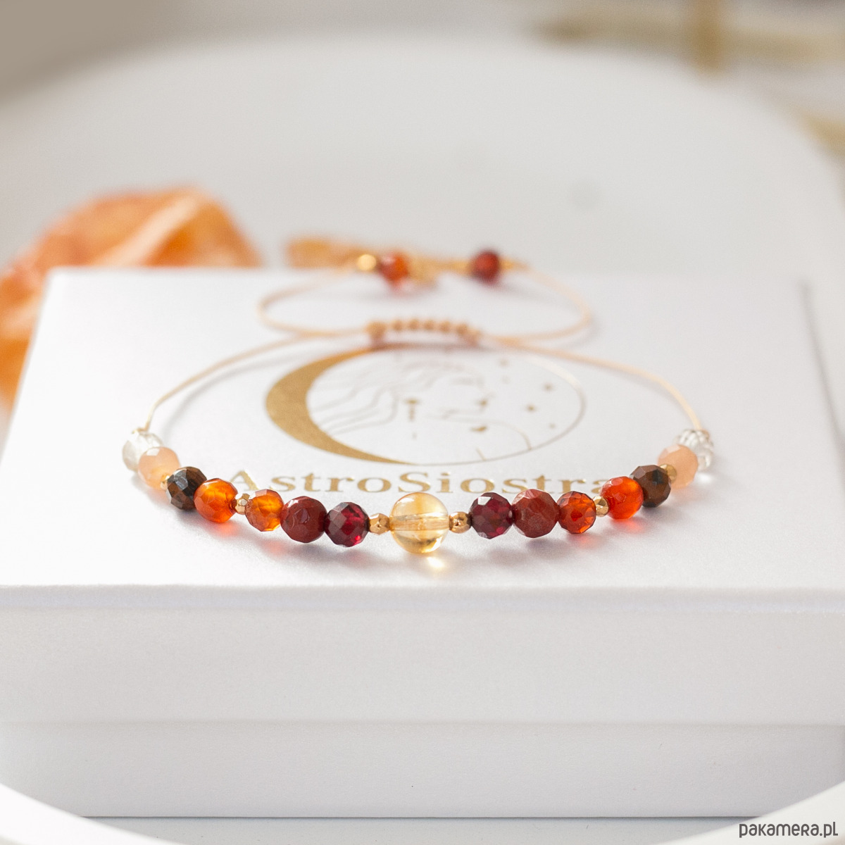 Bransoletka zapakowana jest w ozdobne białe pudełko z logo naszej marki AstroSiostra.