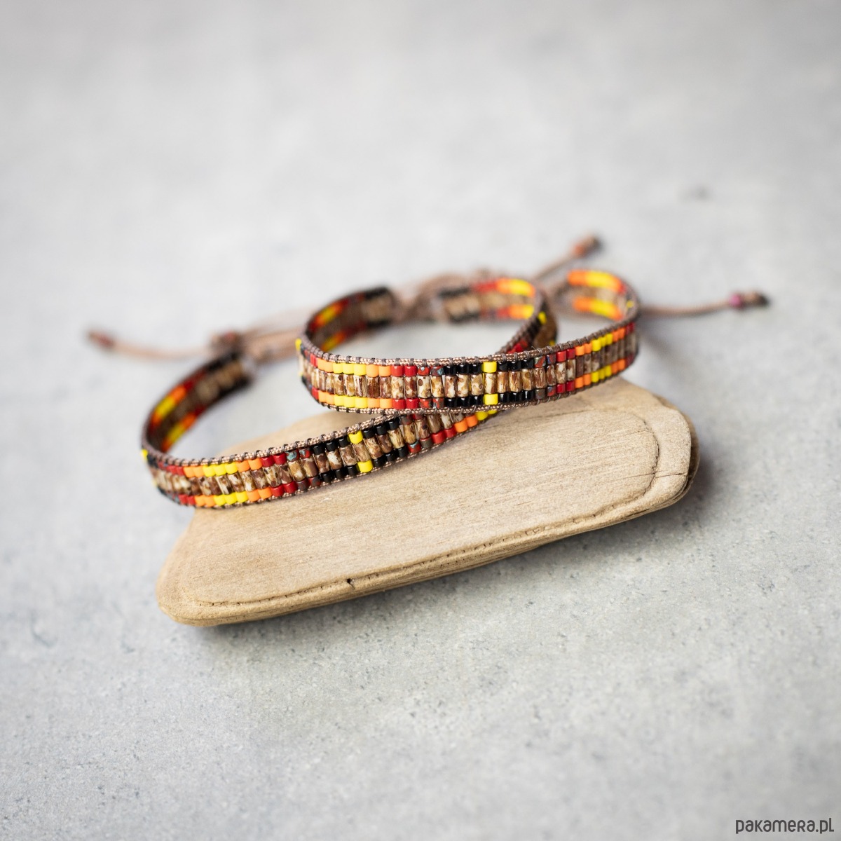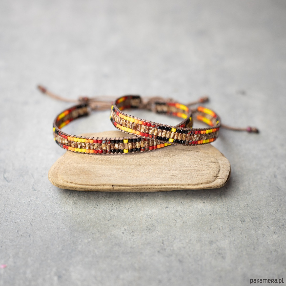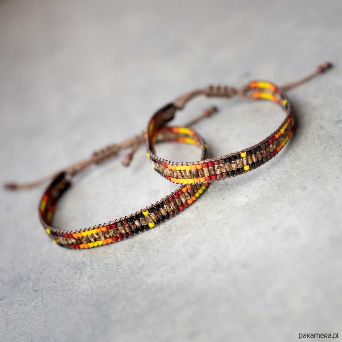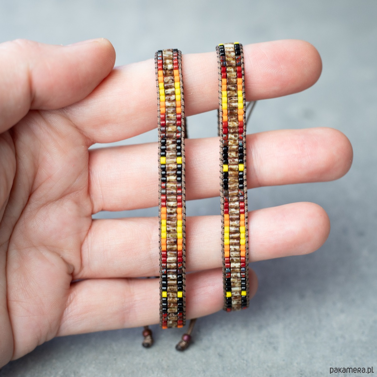 Bransoletki wykonane z koralików szklanych oraz nici i sznurka nylonowego. Kolory: brązowy, czarny, czerwony, pomarańczowy, żółty