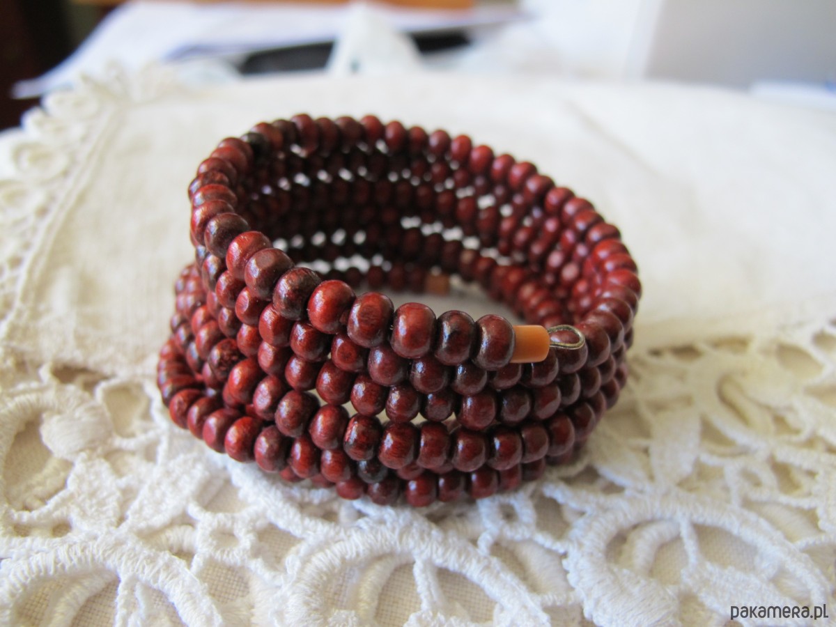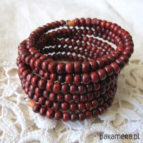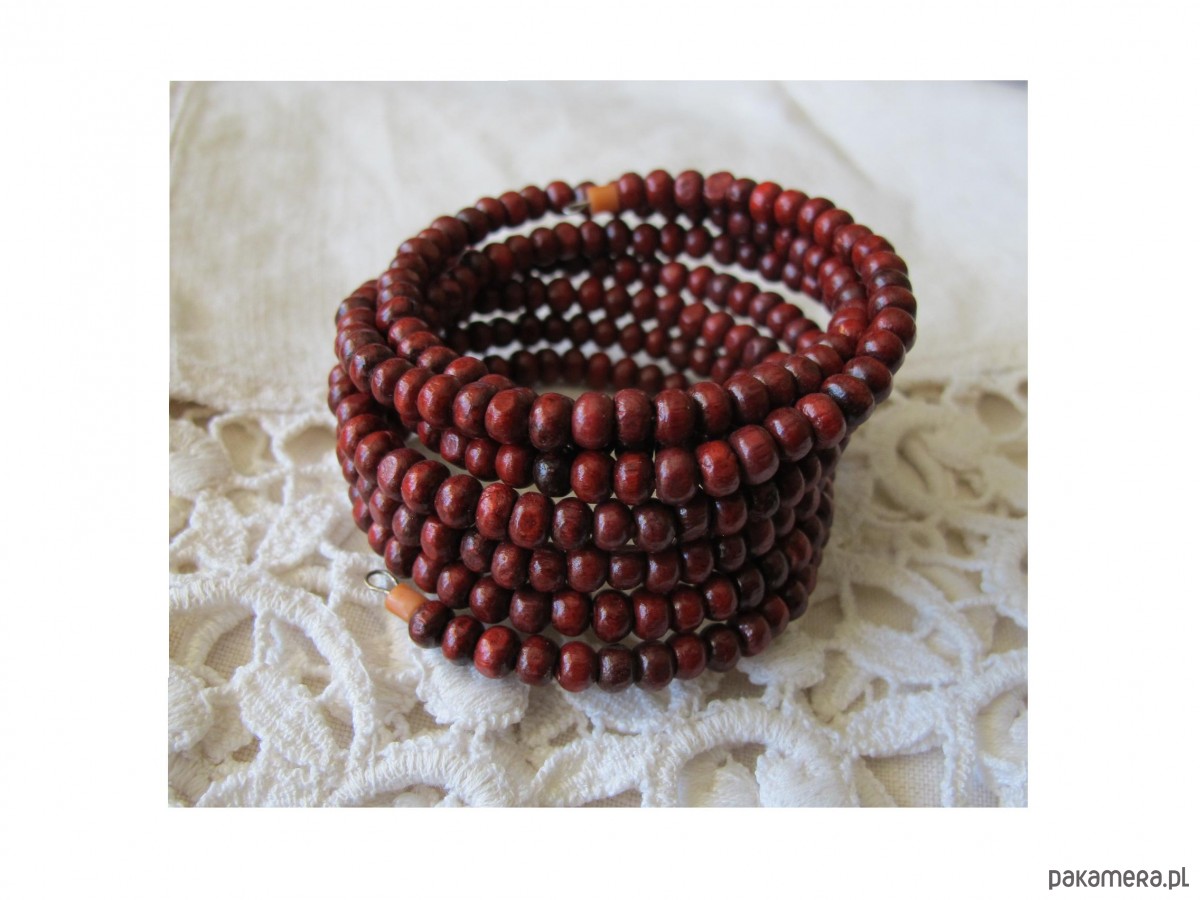 Bransoleta wykonana z drewnianych, lekkich, koralików (śr 0,4 mm) w odcieniach ciepłego brązu, ciemnego karminu o jedwabistym połysku. Jest o uniwersalnej średnicy, na każdą dłoń. Korale są na drucie pamięciowym, zachowującym formę bransolety. Całkowita szerokość bransolety 4 cm, średnica uniwersalna. Dostępna bransoleta z naturalnym koralem na końcach. Polecam.