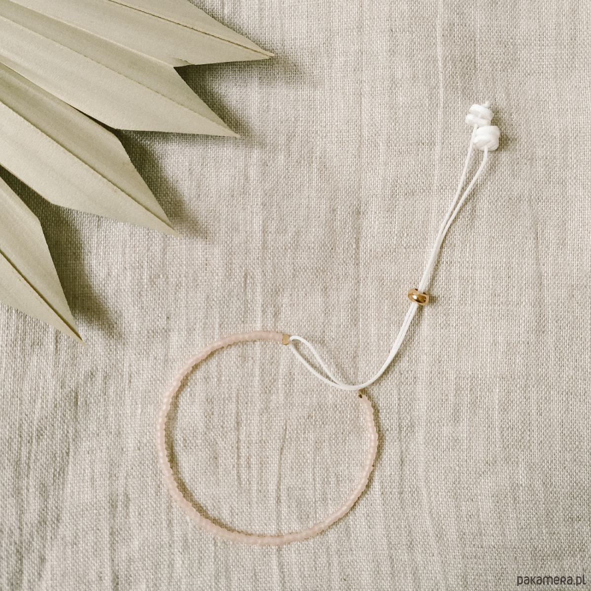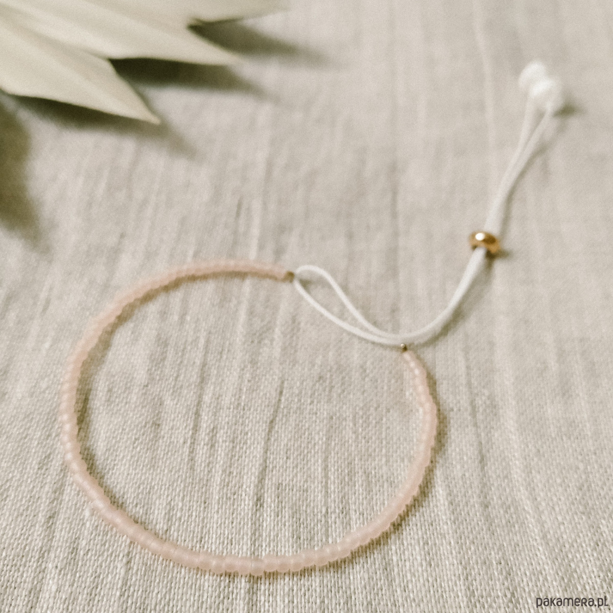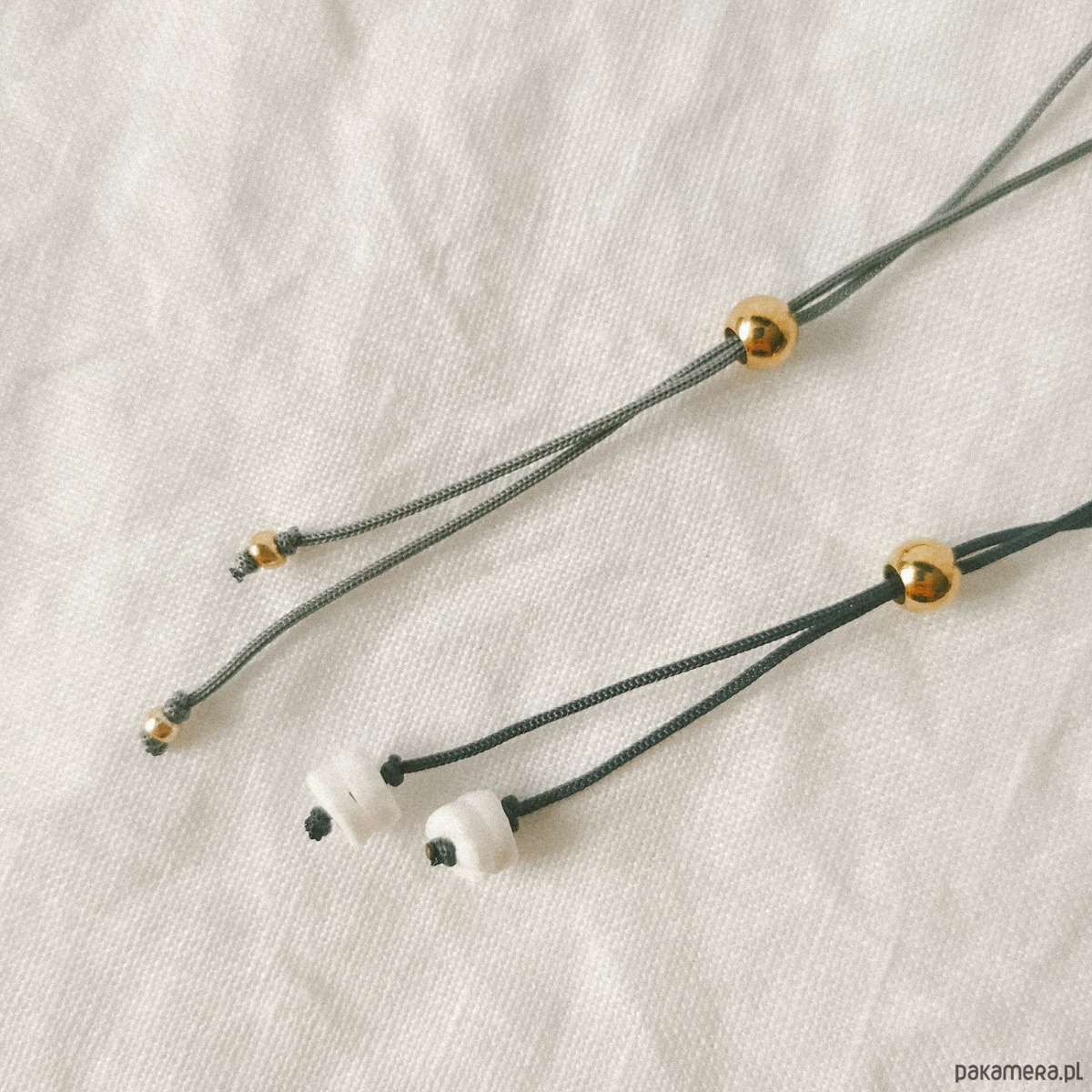 Sam zdecyduj jaki kolor sznurka pasuje do Ciebie najbardziej (biały, błękitny, szary, głęboki granat, leśna zieleń) oraz jakie koraliki będą wykańczać sznurek Twojej bransoletki (złote koraliki ze szkła, białe nieregularne koraliki z muszli czy drobne koraliki z których wykonana jest bransoletka).