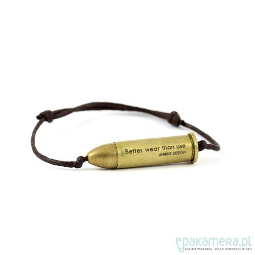 Bransoletka z kolekcji „Better Wear Than Use- Basic”. Wykonana z prawdziwego naboju z wygrawerowaną nazwą kolekcji oraz marką Unikke Design. Bransoletka regulowana, na woskowanym sznurku.