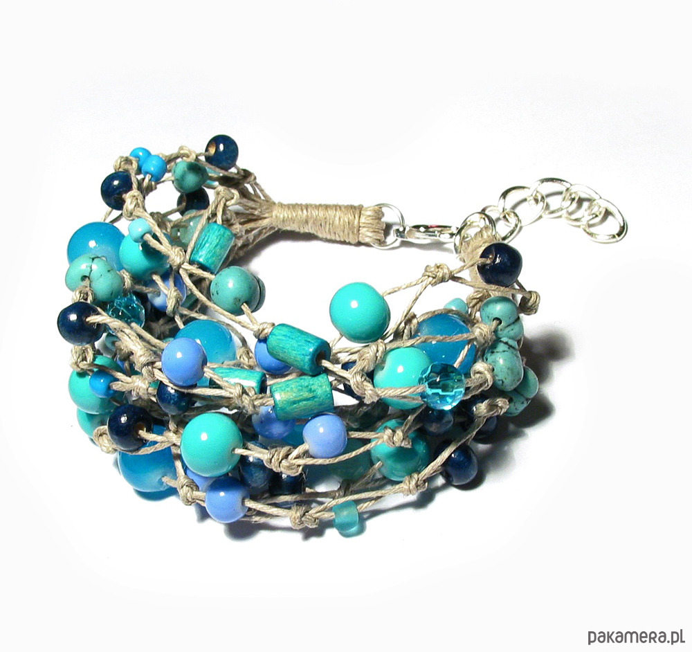 Bransoleta wykonana na bazie naturalnej przędzy lnianej z elementów szklanych, drewnianych oraz bryłek turkusa.