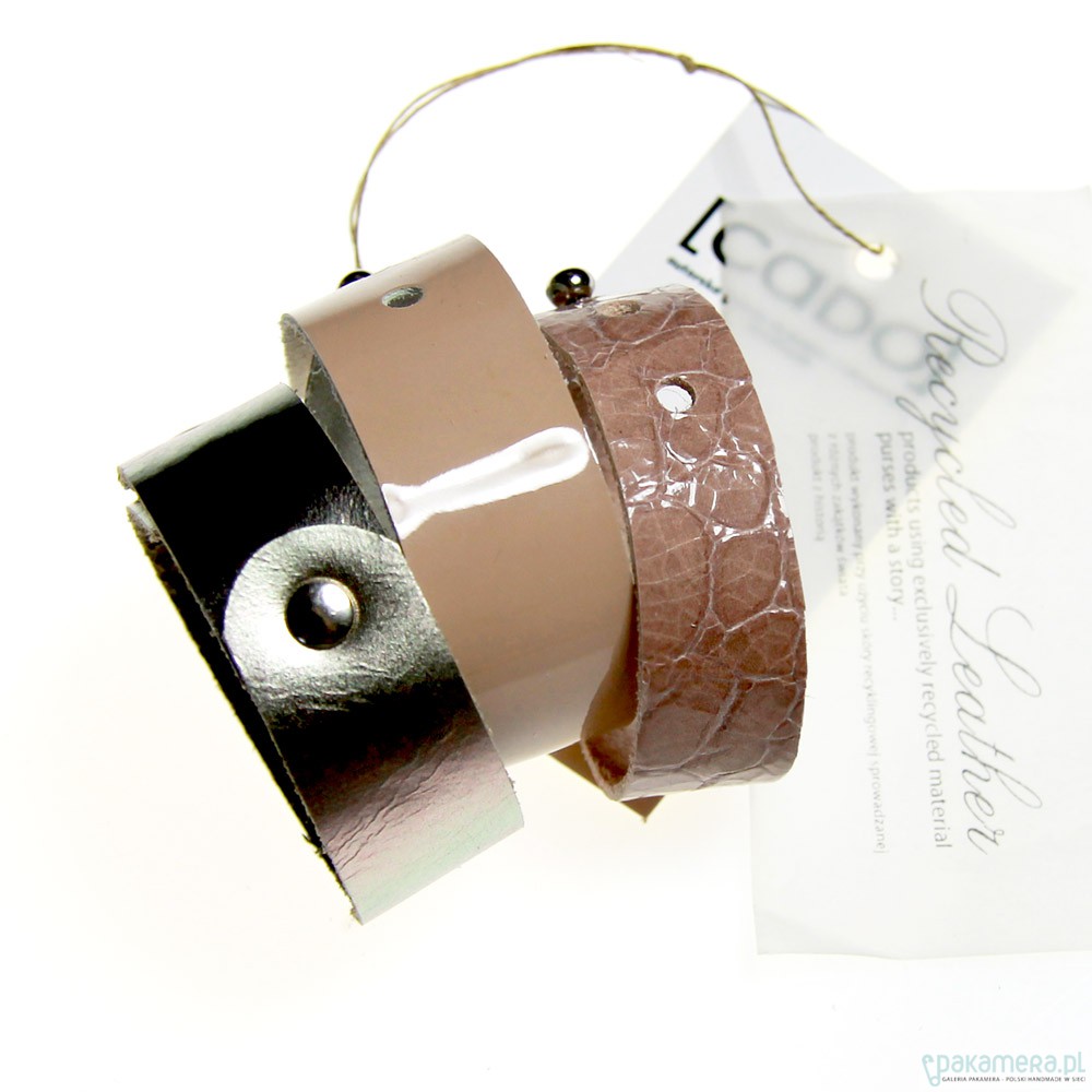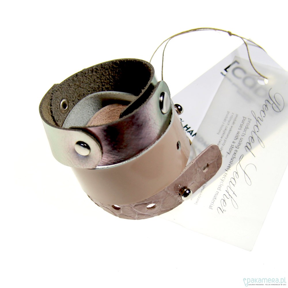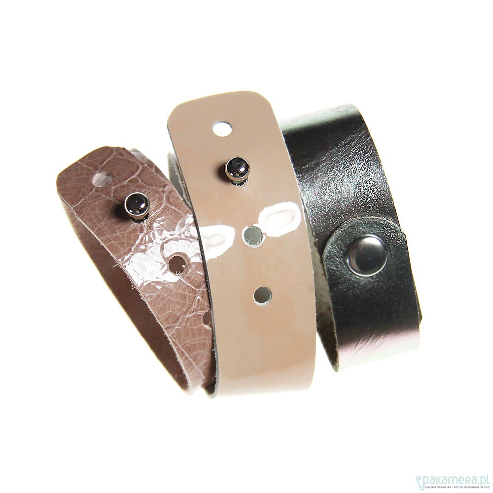 Komplet 3ech bransoletek, wykonanych metodą hand made z włoskiej skóry naturalnej wysokiej jakości. Kobieca kolorystyka - lakierowany, cieniowany nude, pudrowy róż, delikatnie opalizujące srebro. Można je nosić razem lub osobno. Praktyczne, miękkie, efektowne. Zapinane na małe srebrne napy i konopiki. Możliwość regulacji obwodu.