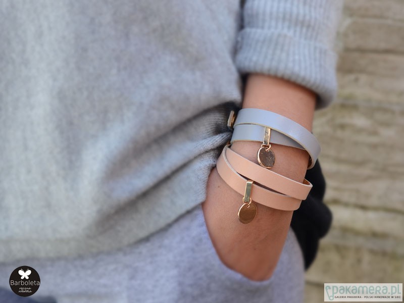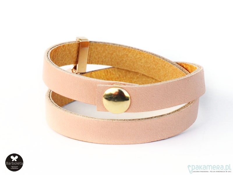 Bransoletka ze skóry naturalnej włoskiej w odcieniu nude/pudrowy róż Elementy metalowe w kolorze złotym. Obwód bransoletki 16 cm po zapięciu. Zapinana na metalowy zatrzask. Do dwukrotnego owinięcia wokół nadgarstka. Wewnątrz wykończona miękką złotą skórą naturalną. Możliwość zamówienia w innym rozmiarze. Lekka i wygodna. Opatrzona metką projektanta. W zależności od ustawień monitora, odcień w rzeczywistości, może się nieznacznie różnić od przedstawionego na zdjęciu. © wzór chroniony prawem autorskim