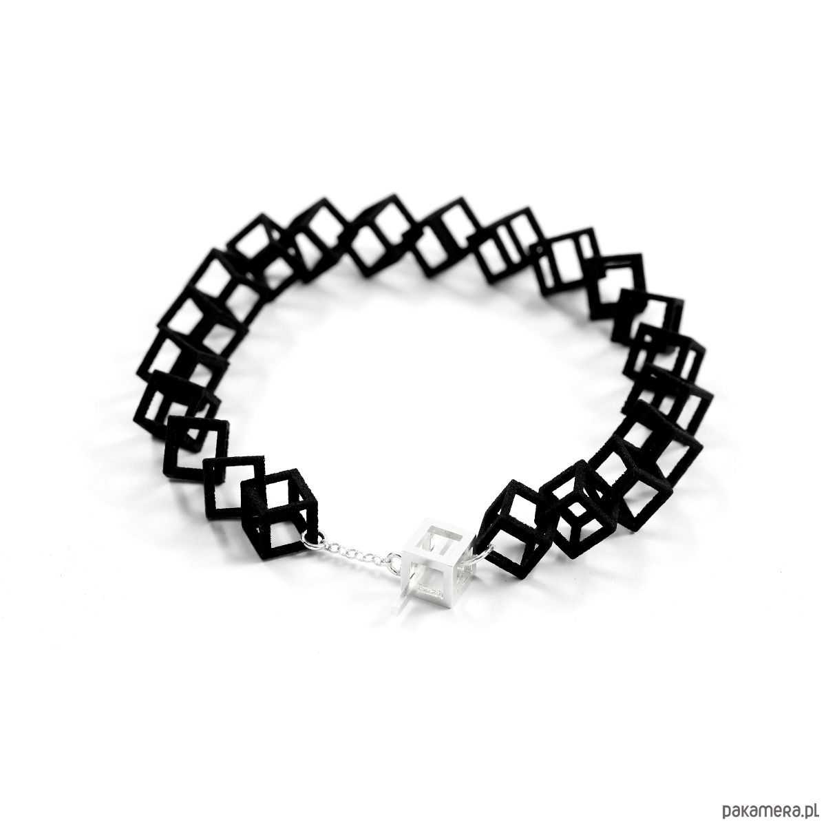 Efektowna bransoletka z kolekcji "Basic Forms" z przestrzennych sześcianów, wykonanych w innowacyjnej technice druku 3D. Wykonana z nylonu w kolorze czarnym, zapięcie ze srebra próby 925. Długość boku sześcianu około 8 mm. Przestrzenny i graficzny efekt. Nylon jest materiałem bardzo lekkim, ale mocnym i wodoodpornym. W wiadomości do zamówienia podaj obwód nadgarstka w celu dopasowania bransoletki.
