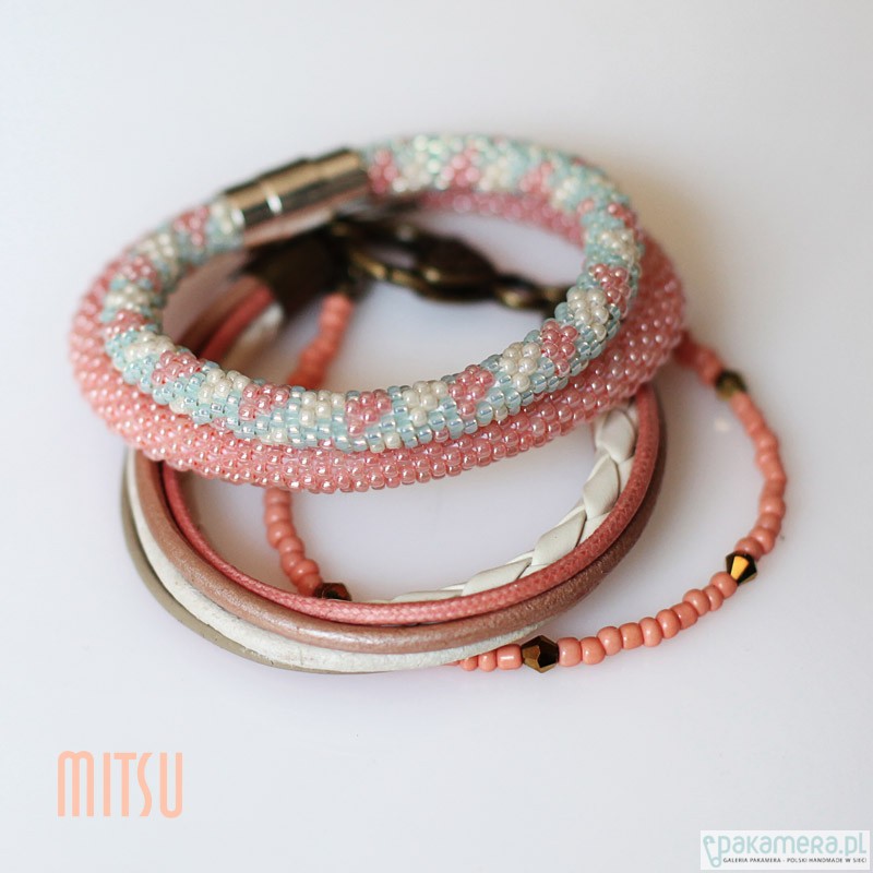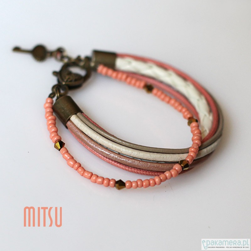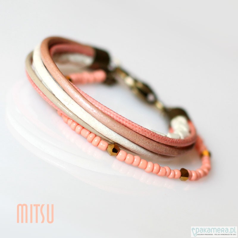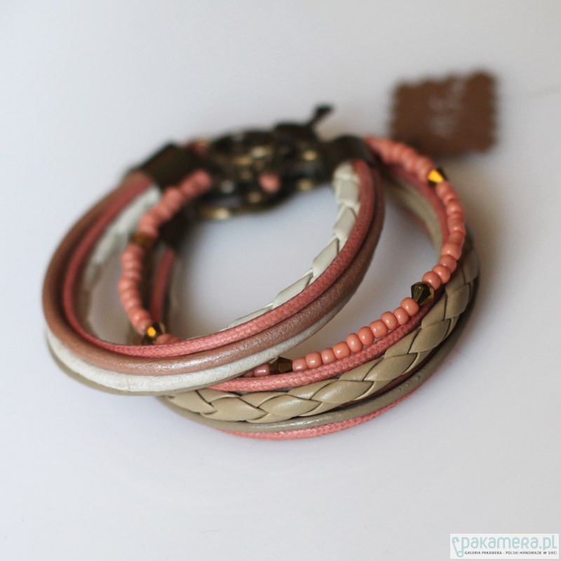 Bransoleta w pięknej gamie, beżu, koralu, ecru. Zbudowana z rzemieni i drobnych szklanych paciorków. Rozmiar: 19- 21 cm. Podróżuje ładnie zapakowana. Polecam :) Świetnie sobie radzi w zestawach jak i solowo.