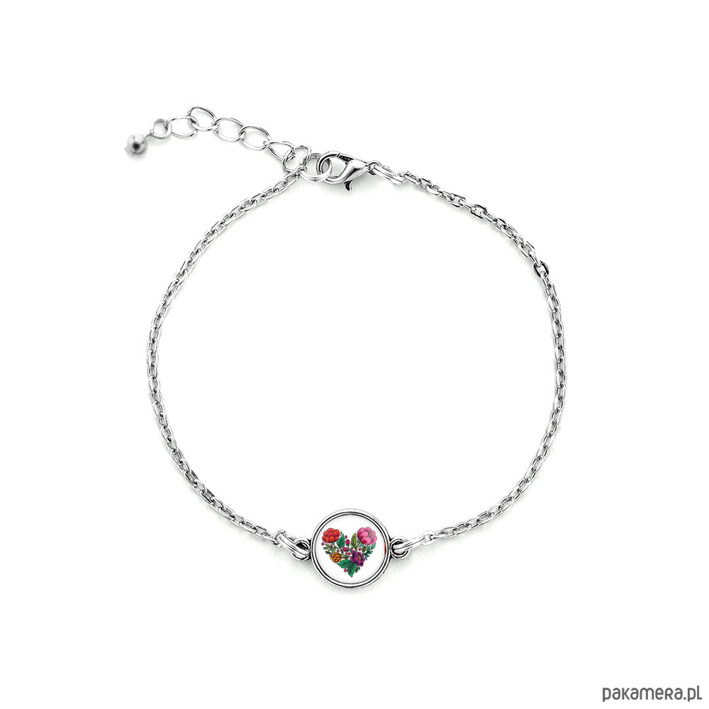 Ręcznie robiona bransoletka z wysokiej jakości grafiką zamkniętą pod wypukłymi szkiełkami i oprawioną w bazę w kolorze srebrnym.