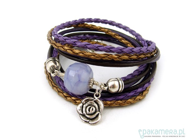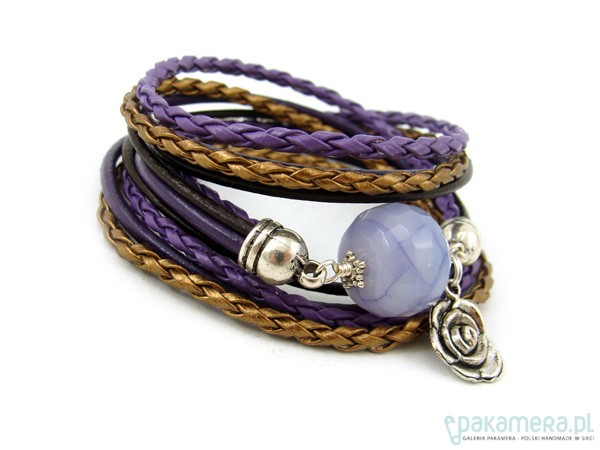 Bransoletka wykonana z rzemieni, kamienia agat wielkości 1,6 cm, elementów srebrzonych. Odpowiednia na nadgarstek o obwodzie: 18 - 19,5 cm. Jeżeli interesuje Państwa inna długość proszę o kontakt przed zakupem.