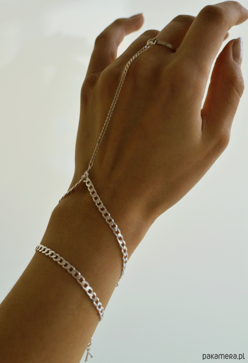 Bransoletkę można nosić na dwa sposoby: z łańcuszkiem i obrączką oraz samą po ich odpięciu.